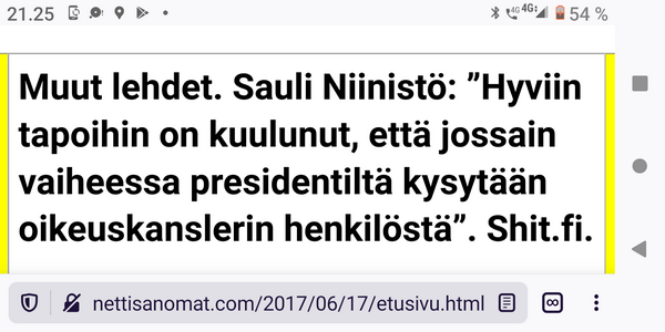 2017 "Kesäkuun 17." ![]() Alkuperäinen artikkeli ja siihen liityvät kommentit. UUSI SUOMI 11.06.2017 Sauli Niinistö: ”Hyviin tapoihin on kuulunut, että jossain vaiheessa presidentiltä kysytään ulkoministerin henkilöstä” Katja Incoronato Luotu: 11.6.2017 17:01 Päivitetty: 11.6.2017 |