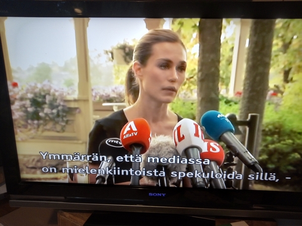 ... ettei ikinä ole käyttänyt huumeita. Marin kommentoi juhlimistaan tiedotustilaisuudessa Kesärannassa. Kuvasarja.