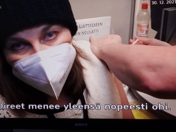 Ylen Hämeen alueen uutisissa toimittaja jonotti puolitoistatuntia koronarokotukseen keskiviikkona 29.12.2021. Kuvat seuraavan päivän uusinnasta klo. 11:16. Pertti Manninen.