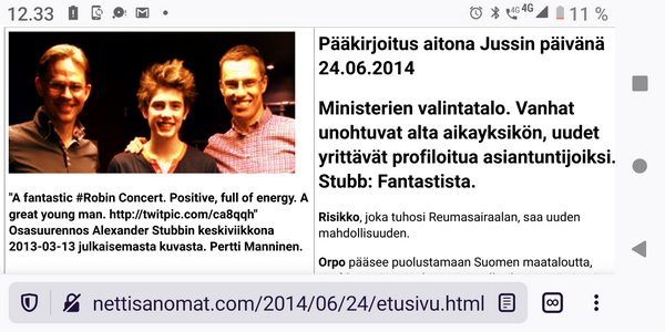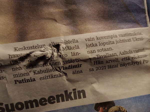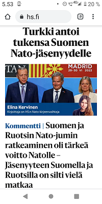 Sanomanetti 2022/12/23 N:o 2575 - Pääkirjoitus. Sähköyhtiöt vs. Marin-Lintilän hallitus: 100 - 0! Sanna Marin pääministerinä ja Mika Lintilä kauppa- ja teollisuusministerinä jäävät historiaan. - Kuusi syytä miksi yrityksellä tulee olla hyvät nettisivut. --- Kuvat ja jutut pääotsikoin. Joutsenen pelastus. - Presidentti Niinistö Ylen haastattelussa. (US) - Kuva: Pukki pulassa. Talvikuvia. - Naapuri boikotissa 2022 ja 2015. - Kuusi kuvaa Kökkelissä. - Ilta-Sanomat: Venäjän lähettilästä ei kutsuttu Linnaan. Arkisto 2015: PRESIDENTTI SAULI NIINISTÖN SELITYS, MIKSEIVÄT VENÄLÄISET PÄÄSSEET ETYK-JUHLAKOKOUKSEEN. Kuvasarja Ylen lähetyksestä. - Joukuun 6. 1999-2022. - Lukijan kuva. Harmaa päivä Itsenäisyyspäivänä 2022. Pohjois-Savo. Keitele. Nilakka. Selänranta. 6.12.2022 10:31. Kuvatervehdyksen lähetti Erika N. - Kuva. Illan hämärtyessä peura on löytänyt lintujen ruokintapaikan. - Pääkirjoitus. Viimeinen itsenäisyyspäivä ilman ydinaseita? Niinistö, Marin, Haavisto. Kuvitettu pääkirjotus. - Kuva: Illan hämärtyessä peura on löytänyt lintujen ruokintapaikan. - Lapsen oikeuksien julistus. - Isänpäiviä 1999-2022. - Arkisto: 1984 KOM TILL VÄSTERÅS STOPPA KÄRNVAPENKRIGET - Ydinase. Kuvia ja kirjoituksia. - Sekaisin. Iltaiset otsikot torstaina 20.10.2022. - Kuva. Myrskyn jälkeen. - Verimyrsky jatkuu 2022. - Kuva. Näin vallankumous tapahtuu Venäjällä. - Kuva. Iltalehti. - Asunnottomuudesta 2005. Arkistokirjoitus. Asunnottomien yö. Valoa pimeydessä 2014. Kuva. - 2022. Kuvasarja. Marinilta kysytään Armageddonista. - "20 vuotta sitten. Jorma Ojaharju: "Devalvoinnin jälkeen . Kuvasarja.- Syksyisenä päivänä. SYYSKUU 2022. JOUTSENET KOKOONTUVAT. - pyrkii kostoiskulla. Iltalehti: Putinin kosto - Sateinen päivä. Kuva. - Eskon loppusanat . Kuva. - Oravan laulu. Makeasti oravainen ... - Tuulinen päivä. Kaksi kuvaa. . - Linkkejä: HS. Kaius Niemi, Päätoimittaja, Ei vastaa. - Arkisto 2008. HS. Janne Virkkunen. Vastaamaton päätoimittaja on raukkamainen alaisiaan kohtaan. - Kissa ja hiiri. Kuva. - Arkisto. Leif Salmén: Voiton päivä? 11.05.2005. - Kotkan Lenin-patsas siirrettiin. Kuvasarja. - Kansanedustaja Ano Turtiainen Eduskunnan keskustelussa - Iltapäivälehtien etusivut. - TIISTAI 4.10.2022 - - Kosovossa 1999. Arkisto. Nato ei tee virhearvioita! - 2022. - Omistajan vastuu. Juha Sipilän hallitus. Antti Rinteen hallitus . Sanna Marinin hallitus - Arto Nyberg. Tietämättömät ministerit vuonna 2002 ja 2017. . Törkeimmät ministerit: - 2017. Uniper. Juha Sipilä ja Mika Lintilä. - Arkisto 2005. Leif Salmén. Voiton päivä? - Fortum ja Uniper. . Saamenmaa, tekojärvet, evakkomatka, Lokka, Porttipahta, tanssiteos "Tumman laineen rannat" - Harkimo - puolustustarvikkeita Ukrainalle - "Tämä on rautaesirippu." Kuvasarja. - Pääkirjoitus: Ukrainan verinen tie Natoon. - Huligaaneja 2006 ja 2009 ja nyt 2022. - Omistajan vastuu 2001 ja 2022. Paavo Lipponen ja Sauli Niinistö. Sanna Marin ja Tytti Tuppurainen. - Eino Leino. - hs24.fi - härkää sarvista - Recep Tayyip Erdoğan, Sauli Niinistö ja Magdalena Andersson - Kakabahev kurdit Nato-jäsenyyden vuoksi. - Juhannushäät. - Särkynyt ja särjetty idylli. - Niinistö. Turkki Musiikkimiehiä. suomalaisia tykistöammuksia. - Suomen asevienti sotaan 2022. - Kurdit myytävänä. Suomi 2022. - Saamelaisten kansallispäivä. - 27.1 vainojen uhrien muistopäivä - SYYSKUU 2016. ORAVA TAMMESSA. - Vuosisadan kuva: Sirkka Hämäläinen, Sauli Niinistö, Johnny Åkerholm. - SMILE from MODERN TIMES - "Förbjud atomvapnen". 1957 KUVA - etusivu - Perjantai 23.12.2022. - Kuvasanomat - Sanomatori - Viikkosanomat - Härkää sarvista - 12.fi -