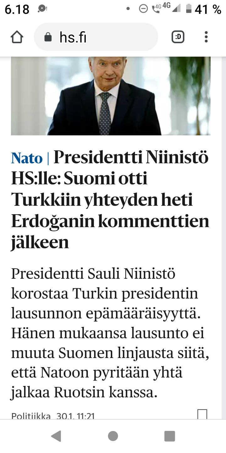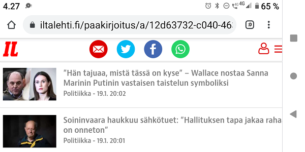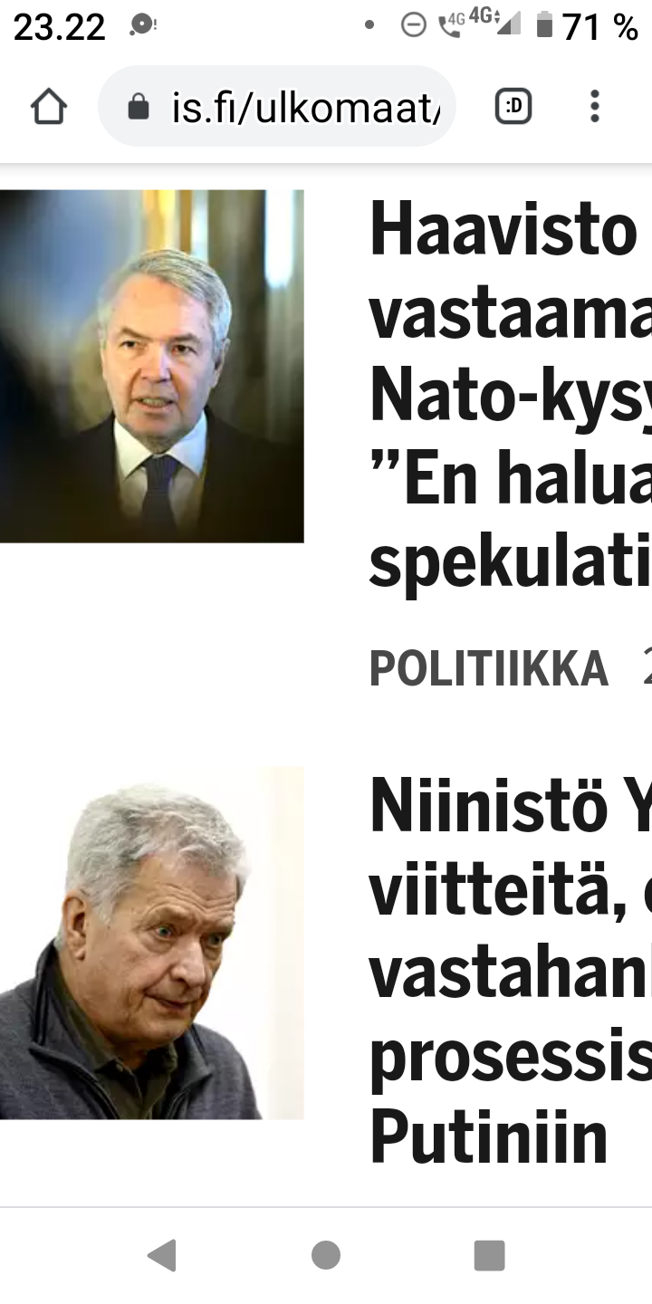 2023 helmikuu. Perjantai 3.2.2023. Pääministeri Marin otti johtajan roolin:"Suomi ja Ruotsi jatkavat käsi kädessä Natoon." Lue! Perjantai 3.2.2023. Taipui ja osin taittuikin. Kuva Tiistaina 7.2.2023. Iltalehti: Presidentti Sauli Niinistö on joutunut vaihtamaan nimensäkin ... Lue! Perjantaina 10.2.2023. Hupsaus: Nadonlukua tammikuun lopulla 2023. Lue! Lauantaina 11.2.2023. 20 vuotta sitten Lue! - 15 vuotta sitten Lue! - 10 vuotta sitten Lue! - 5 vuotta sitten Lue! Lauantaina 11.2.2023. Vuosi sitten. Arkisto 27.2.2022. Lue! Lauantaina 11.2.2023. 20 vuotta sitten. Torstaina 13.2.2003. Lue! Sunnuntaina 12.2.2023. "Puhun rauhasta ymmärtäen sen, että tällä hetkellä ei ole minkäänlaisia edellytyksiä rauhaan." Presidentti Sauli Niinistö. Lue! Sunnuntaina 12.2.2023. Ukrainaan ei lähtenyt Suomesta vuosi sitten "pehmeää pakettia". Lue! Sunnuntaina 19.2.2023. Marin: Venäjä olisi pitänyt eristää jo aiemmin - Niinistö: Suomen reaktio näkyi teoista. Lue! Sunnuntaina 19.2.2023. Arkisto 2005. Leif Salmén. Voiton päivä? Kolumni. Lue! Tiistaina 21.2.2023. Tähän on tultu. Putin: Venäjä jäädyttää ydinasesopimuksen tai lopettaa noudattamisen. Lue! Tiistaina 28.2.2023. Kalevalan päivän liputusta 2013 ja 2023. |