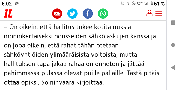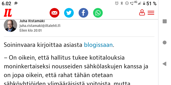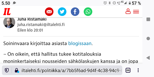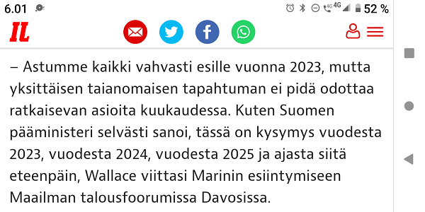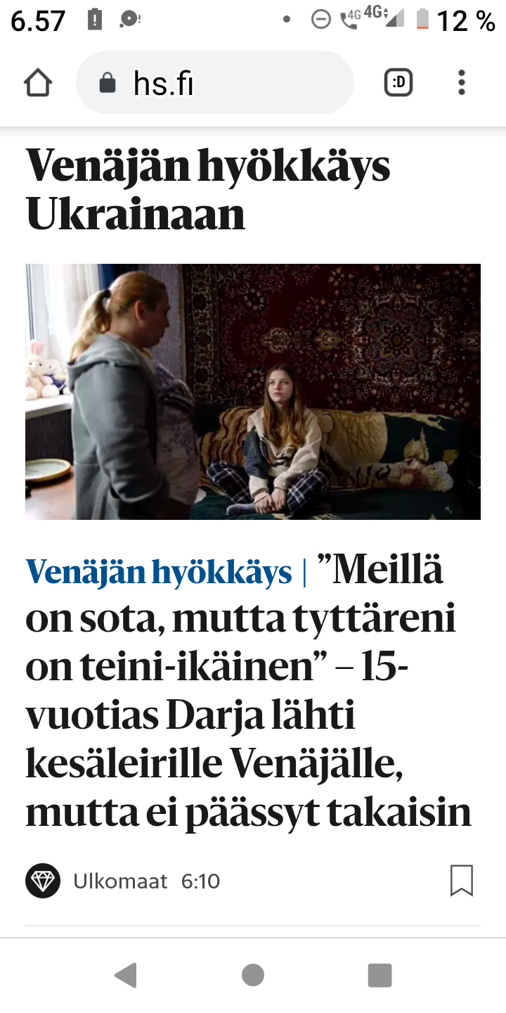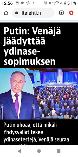 vientiluvasta, Ylelle kerrotaan." Pääkirjoitus. Olisi lupa vaikka Paavilta, niin Suomen hallitus pääministeri Marinin johdolla ja tasavallan presidentti Sauli Niiistö siis katsovat sopivaksi lähettää Suomen päätösvallassa olevia aseita sotatoimialueelle. Maailma on raaka. Tappaminen kuitenkaan lopu tappamalla ja näillä Niinistön ja Marinin lähettämillä aseilla sitten tapetaan venäläisiä sotilaita ja varmaan myös ukrainalaisiakin ja siviiliväestöä. Ei niiden osumatarkkuus ole 100 prosenttia ja sodassa ne voivat pian olla vastapuolenkin käytössä. Historia tulee kertomaan oliko Suomen hallituksen osumatarkkuus tässä asiassa paikallaan. Pääkirjoitus. Pertti Manninen sunnuntaina 27.2.2022 11:39. Lainaus ja kuva Ylen artikkelista: Venäjän hyökkäys |