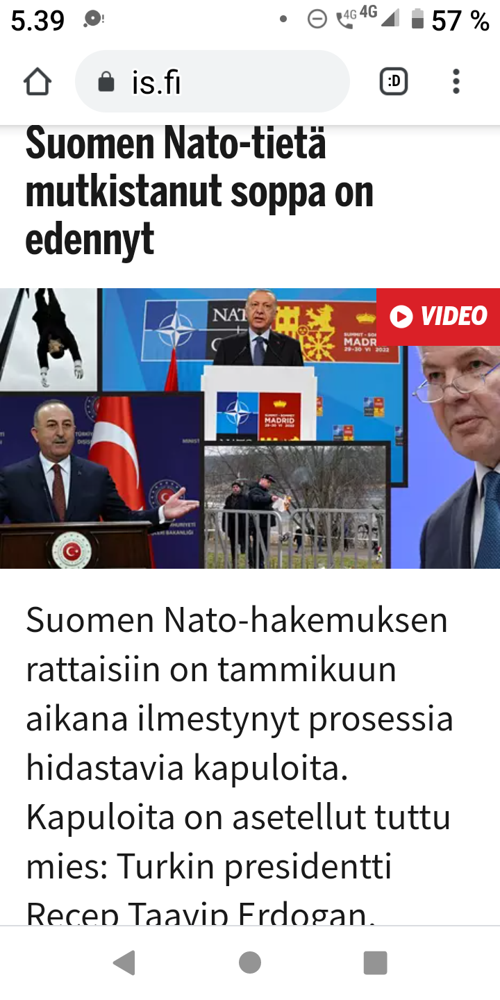 Pääkirjoitus: Ukrainan verinen tie Natoon. Venäjän julma ja verinen hyökkäys naapurimaahansa Ukrainaan jatkuu ja jatkuu. Nyt on menossa jo 168. päivä. Media käyttää tästä sodasta nimitystä "Ukrainan sota". Pikemminkin pitäisi käyttää nimitystä "Venäjän sota". Mitään rauhanneuvotteluja ei vielä käydä. Nato-maat ja Natoon
