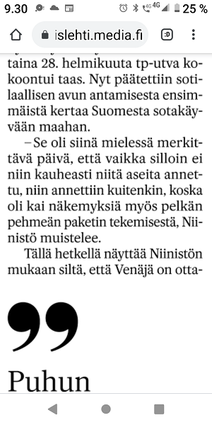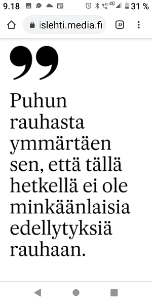 "Puhun rauhasta ymmärtäen sen, että tällä hetkellä ei ole minkäänlaisia edellytyksiä rauhaan." Keskisuomalainen sunnuntaina 12.02.2023. |
