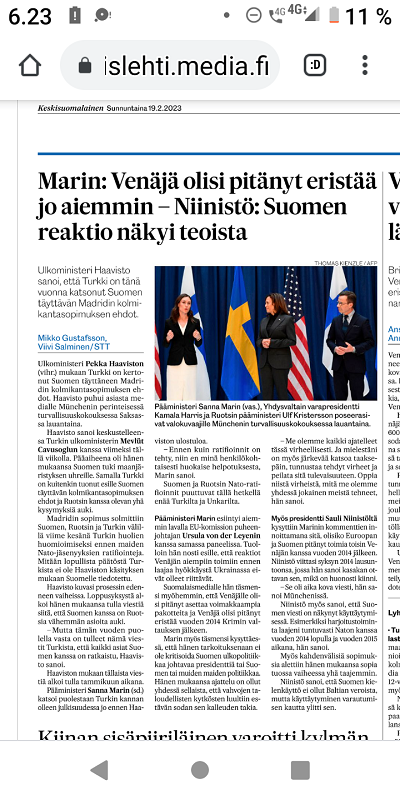 Pääministeri Sanna Marin (vas.), Yhdysvaltain varapresidentti Kamala Harris ja Ruotsin pääministeri Ulf Kristersson poseerasivat valokuvaajille Münchenin turvallisuuskokouksessa lauantaina. ... - Ennen kuin ratifioinnit on tehty, niin en minä henkilökohtaisesti huokaise helpotuksesta, Marin sanoi. Suomen ja Ruotsin Nato-ratifioinnit puuttuvat tällä hetkellä enää Turkilta ja Unkarilta. Pääministeri Marin esiintyi aiemmin lavalla EU-komission puheenjohtajan Ursula von der Leyenin kanssa samassa paneelissa. Tuolloin hän nosti esille, että reaktiot Venäjän aiempiin toimiin ennen laajaa hyökkäystä Ukrainassa eivät olleet riittävät. Suomalaismedialle hän täsmensi myöhemmin, että Venäjälle olisi pitänyt asettaa voimakkaampia pakotteita ja Venäjä olisi pitänyt eristää vuoden 2014 Krimin valtauksen jälkeen. Marin myös täsmensi kysyttäessä, että hänen tarkoituksenaan ei ole kritisoida Suomen ulkopolitiikkaa johtavaa presidenttiä tai Suomen tai muiden maiden politiikkaa. Hänen mukaansa ajattelu on ollut yhdessä sellaista, että vahvojen taloudellisten kytkösten luultiin estävän sodan sen kalleuden takia. - Me olemme kaikki ajatelleet tässä virheellisesti. Ja mielestäni on myös järkevää katsoa taaksepäin, tunnustaa tehdyt virheet ja peilata sitä tulevaisuuteen. Oppia niistä virheistä, mitä me olemme yhdessä jokainen meistä tehneet, hän sanoi. Myös presidentti Sauli Niinistöltä kysyttiin Marinin kommenttien innoittamana sitä, olisiko Euroopan ja Suomen pitänyt toimia toisin Venäjän kanssa vuoden 2014 jälkeen. Niinistö viittasi syksyn 2014 lausuntoonsa, jossa hän sanoi kasakan ottavan sen, mikä on huonosti kiinni. - Se oli aika kova viesti, hän sanoi Münchenissä. Niinistö myös sanoi, että Suomen viesti on näkynyt käyttäytymisessä. Esimerkiksi harjoitustoiminta laajeni tuntuvasti Naton kanssa vuoden 2014 lopulla ja vuoden 2015 aikana, hän sanoi. Myös kahdenvälisiä sopimuksia alettiin hänen mukaansa sopia tuossa vaiheessa yhä taajemmin. Niinistö sanoi, että Suomen kielenkäyttö ei ollut Baltian veroista, mutta käyttäytyminen varautumisen kautta ylitti sen. Keskisuomalainen sunnuntaina 19.2.2023.