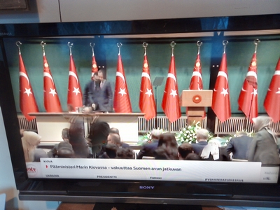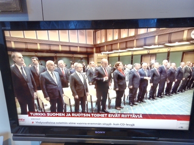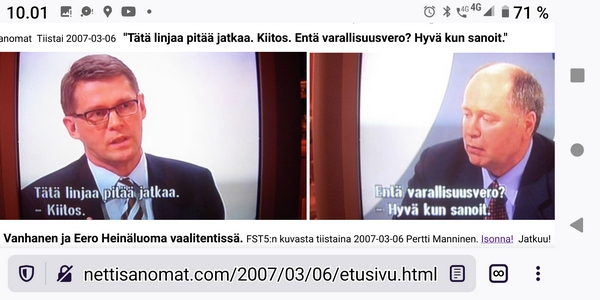 2007-04-13. Nettisanomat. Suomalaiset herrasmiehet Matti Vanhanen ja Jyrki Katainen rojahtamassa sijoilleen Tarja Cronbergin vetäessä tuoliaan hallitusneuvottelujen tiedotustilaisuudessa Säätytalolla perjantaina 2007-04-13. FST:n uutislähetys klo 18.15. Kuva: Pertti Manninen. Isonna! Pääkirjoitus. Tapoja Matti Vanhanen ja Jyrki Katainen! Kaiken korskeuden keskellä ei tarvitse käyttäytyä moukkamaisesti naishenkilöä kohtaan. Vt. pääministerinkin pitäisi ymmärtää, että hän on hallitustunnustelujen vetäjä ja hänen edustamallaan puolueella on sittenkin vain neljäsosa eduskuntapaikoista. Kohteliaisuutta korskeuden sijaan. Hyviä tapoja välinpitämättömyyden sijaan. Eikö viiskymppinen mies ole tällaista vielä oppinut? Huomaavaisuus naisen istahtaessa ja tuolin vetäminen sopisi myös "Euroopan presidentiksi " itseään kutsuneelle mörrikälle. Perjantaina 2007-04-13. Pertti Manninen. Maanantai 2007-04-16. Hufvudstadsbladet (Kuva: Tor Wennström). Matti Vanhanen on oppinut herrasmiehen tavoille ja pitelee tuolia Tarja Cronbergin istuutuessa Säätytalolla pidetyssä tiedotustilaisuudessa sunnuntai-iltana. Kuva Pertti Manninen postin saavuttua. Isonna! "Regeringsprogrammet. Folkpensioner och studiebidrag höjs. Regeringen lovar stärka välfärden". Foto: "Nu är det klart, Stefan Wallin, Jyrki Katainen, Matti Vanhanen och Tarja Cronberg kunde i går kväll berätta att regeringsförhandlingarna nu rotts i hamn. Ministerlistan spikas i början av veckan". HBL Måndag 16 april 2007. http://www.nettisanomat.com/2007/04/16/etusivu.html |