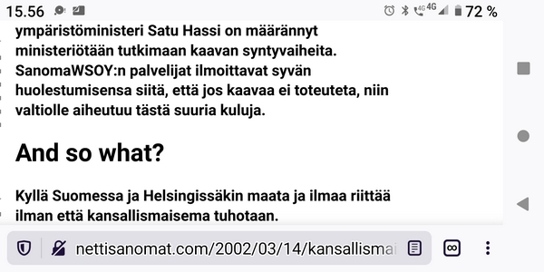 Lauantaina 4.3.2023. Ydinasevaltio Suomi. Lue! Perjantaina 3.3.2023. Arkisto. Maanantai 16.4.2007 klo 14.30. Pääministerikin lukee Nettisanomia! Suomalaiset herrasmiehet Matti Vanhanen ja Jyrki Katainen. Lue! Keskiviikkona 1.3.2023. Jotakin maaliskuussa 2000- 2022. Lue! Tiistaina 28.2.2023. Kalevalan päivän liputusta 2013 ja 2023. Kuvat Tiistaina 21.2.2023. Tähän on tultu. Putin: Venäjä jäädyttää ydinasesopimuksen tai lopettaa noudattamisen. Lue! |