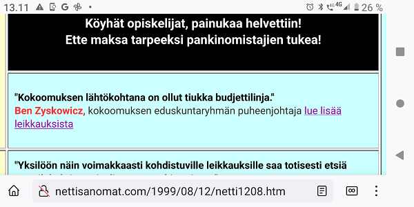 Sanomanetti - Sunnuntaina 8.10.2023. Nettisanomia heinäkuulta 1999 - elokulta 1999 - syyskuulta 1999. --- Arkisto. Keskiviikkona 27.9.2023. Selkänahka vaarassa! Lisää Leikkauksia tulossa? 12.8.1999- - Arkistosta 1999. Opiskelijoiden kurmuutus. Kurmuuttajat: 12.8.1999. Ben Zyskowicz, kokoomuksen eduskuntaryhmän puheenjohtaja Lue! 12.8.1999. Janne Virkkunen, Helsingin Sanomien vastaava päätoimittaja Lue! 16.9.1999. Paavo Lipponen, pääministeri Lue! 16.9.1999. Sauli Niinistö, valtiovarainministeri Lue! 16.9.1999. Ben Zyskowicz, kokoomuksen eduskuntaryhmän puheenjohtaja Lue! 16.9.1999. Suvi Linden, kulttuuriministeri Lue! 30.9.1999. Pekka Kettunen, Jyväskylän kaupunginjohtaja Lue! 30.9.1999. Suvi Linden, opetusministeri Lue! Puolustajat: 12.8.1999. Vertti Kiukas, Helsingin yliopiston ylioppilaskunnan hallituksen jäsen Lue! 30.9.1999. Saana Siekkinen, Ammattiin Opiskelevat-Sakki ry:n edunvalvontasihteeri Lue! - 24 vuotta sitten: torstaina elokuun 12. päivänä 1999 Köyhät opiskelijat, painukaa helvettiin! Ette maksa tarpeeksi pankinomistajien tukea! "Kokoomuksen lähtökohtana on ollut tiukka budjettilinja." Ben Zyskowicz, kokoomuksen eduskuntaryhmän puheenjohtaja lue lisää leikkauksista "Yksilöön näin voimakkaasti kohdistuville leikkauksille saa totisesti etsiä vertailukohtia sosiaaliturvamme historiasta." "Jos leikkaus toteutetaan, menettää opiskelijaperhe pahimmillaan yli 7000 markaa vuodessa, keskimäärinkin pitkälti yli 4000 markkaa. Vertti Kiukas, Helsingin yliopiston ylioppilaskunnan hallituksen jäsen lue lisää hallitusohjelmapetoksesta "Pienetkin leikkaukset tuntuvat opiskelijan kukkarossa pahalta, mutta kaikki on suhteellista." Helsingin Sanomien pääkirjoitus, (lehden vastaava päätoimittaja on Janne Virkkunen). lue lisää leikkauksista. ---Tiistaina 26.9.2023. Lähtöä odottaen. Joutsenet pellolla. Uusimaa. Kirkkonummi. Lapinkylä. Maanantai 25.9.2024 15:33. Kuva Pertti Manninen. - Kommentti: Orpo ja Purra yrittävät tökeröä taloustemppua, jolla Reagan ja Thatcherkin saivat aikaan mittavaa vahinkoa. Lue! Kommentti. Jan Hurri. Ilta-Sanomat Taloussanomat Sunnuntai 24.9.2023. Lue! "Tulonsiirrot köyhiltä rikkaille ovat tökeröä politiikkaa, mutta ne eivät ole Orpon tai Purran keksintöä. Samaa kokeilivat jo 1980-luvun ”suuret talous-uudistajat" Reagan ja Thatcher – surkein seurauksin." --- Sunnuntaina 24.9.2023. Syksyn lehdet metsäojassa. Lehdet ja risut odottavat talvea ja kevättä muhentaakseen uutta voimaa seuraavalle kesälle. Uusimaa. Kirkkonummi. Lapinkylä. Sunnuntai 24.9.2024 15:18. Kuva Pertti Manninen. - Näin paljon korkeakoulu- opiskelijoiden talous on heikentynyt: Yliopistoja valtaavien opiskelijoiden huoli on aito. Uusi Suomi. Kommentti. Sonja Mänty. Lue! --- Perjantaina 22.9.2023. Ajankohtaista narutusta? Narutusta Mansessa 2023 Narutusta Moskovassa 2022. - Keskiviikkona 20.9.2023. KALTSIN KALTSIT Valokuvaaja Aulis Nyqvist järjesti kirjaimet riviin ja niin syntyi slangikirja "KALTSIN KALTSIT (Bammailua Kaltsista) tunnelmiin liittyvin valokuvin. - HS: Kirjailija Torsti Lehtinen kuollut Kirjailija, filosofi ja kääntäja Torsti Lehtinen on kuollut lauantaina Helsingissa. Lehtinen oli 81-vuotias. Ylen tekstitv tiistaina 19.9.2023 16:20 Tuuli käy heidän ylitseen. RIP Torsti. Pertti Manninen. - Keskiviikkona 20.9.2023. Niinistön sanoja ja puheita tulkitaan ja ihmetellään. Ilta-Sanomat tiistai 19.9.2023 Venäjän media kuhisee ERIKOISIA TULKINTOJA NIINISTÖN SANOISTA Iltalehti tiistai 19.9.2023 Huippuasiantuntija IHMETTELEE NIINISTÖN YDINASEPUHEITA. --- Maanantaina 18.9.2023. Luottamusta. Ulkomaat Niinistö Putin HS 17.9. - Trump Putin Iltalehti 17.9. - Erdogan Ilta-Sanomat 16.9. - Ardern Støre Marin Trudeau HS 17.9.2023. Kotimaa Orpo Iltalehti 15.9. - Orpo Nettisanomat 20.6. Kuvasarja. - Orpo HS 15.9. - Orpo HS 15.9.2023. Luottamusta. --- Sunnuntaina 17.9.2023. Varrella viikon. Luontokuvia. Maanantaina 11.9.2023. ... Kurjet torstaina 14.9.2023 09:31. Uusimaa. Kirkkonummi. Lapinkylä. ---- Tiistaina 12.9.2023. Teuvo Suomisen vaikuttavat kuvat. Teuvo Suomisen vaikuttavat kuvat. Viisi vuosikymmentä kantaaottavan luonnonvalokuvan historiaa. --- Maanantaina 11.9.2023. Henrik Meinander: Itseään kunnioittava kansakunta ei siivoa historiaansa katukuvasta. HS Mielipide. 9.9.2023. Lue! - Arkisto 2022. Perjantai 27.5.2022. Lenin sai kyytiä Turusta. Turun kaupunginjohtaja Minna Arve (kok), Petteri Orpo, - 2011: Siittimen palautus Rakveressa. Kuvasarja! --- Sunnuntaina 10.9.2023. Arkisto 2005. Tulossa? 19.03.2005. George W. Bush ja Tony Blair sekä Saddam kahleissa. - Leif Salmén. Kolumni. Taas raha puhuu. Iltalehti keskiviikkona 13.4.2005. --- Perjantaina 8.9.2023. Sanna Marin paholaisen palkkalistoille Pääkirjoitus. Perjantai 8.9.2023 20:01 Kuva. --- Torstaina 7.9.2023. Arkistokuvat: Helsinki 1952: "Jenkkineekeri ei kuitenkaan saa sisään lopullista tyrmäysiskua". --- Maanantaina 4.9.2023. Narutusta Mansessa 2023. - Narutusta Moskovassa 2022 "... että Suomen ja Ruotsin taustalla naruista vetelee Yhdysvallat." -20 vuotta sitten 4.9.2003 - Hän ottaa vastuun - mutta mistä? Blair - Bergholm: Jäähyväiset Lipposelle! - Sarjakuva! Moe Ranskassa. Lue! --- Torstaina 31.8.2023. Monenlaisia ihmisiä asemalla. - Epätäydellinen maailma. Ylen A-talk torstaina 31.8.2023 21:05. Rasismikeskustelu puheentunnitusohjelmalla. --- Maanantaina 28.8.2023. Hetki: Kurjet lentävät. Lauantaina 27.8.2023 15:22. - Nettisanomat 20 vuotta sitten 28.8.2003. Helsinki 2003. Hirmuiset helteet jatkuvat. - Irak. - "Stop Women's Abduction & Killing". Raiskaukset kuuluvat Irakin arkipäivään. Bagdad. - Nettisanomat 20 vuotta sitten 28.8.2003. I have a dream. - Kuka hän on? - Nettisanomat 20 vuotta sitten 28.8.2003. - Pääkirjoitus. Onko mikään muuttunut? IS esittelee Niinistön uuden naisystävän. --- Torstaina 24.8.2023. Putin vs Prigožin. - Arkisto. Nettisanomat 20 vuotta sitten 21.8.2003. --- Keskiviikkona 16.8.2023. Arkisto 20 vuotta s