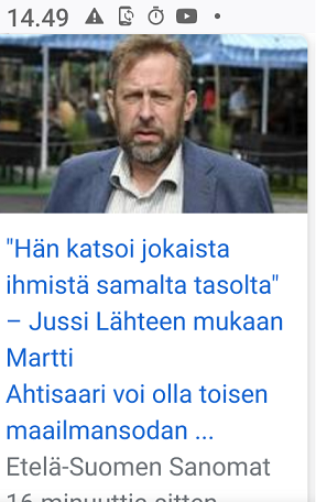 https://www.is.fi/paakirjoitus/art-2000009925817.html https://www.iltalehti.fi/jalkapallo/a/7aa22776-a5e2-428a-8137-a85ea246f8bd https://www.ess.fi/uutissuomalainen/6284364 https://www.presidentti.fi/uutinen/presidentti-martti-ahtisaari-1937-2023/ https://www.aamulehti.fi/ihmiset/art-2000009925789.html https://www.ksml.fi/paikalliset/6283462 Kuvat: Pertti Manninen. Maanantai 16.10.2023 |