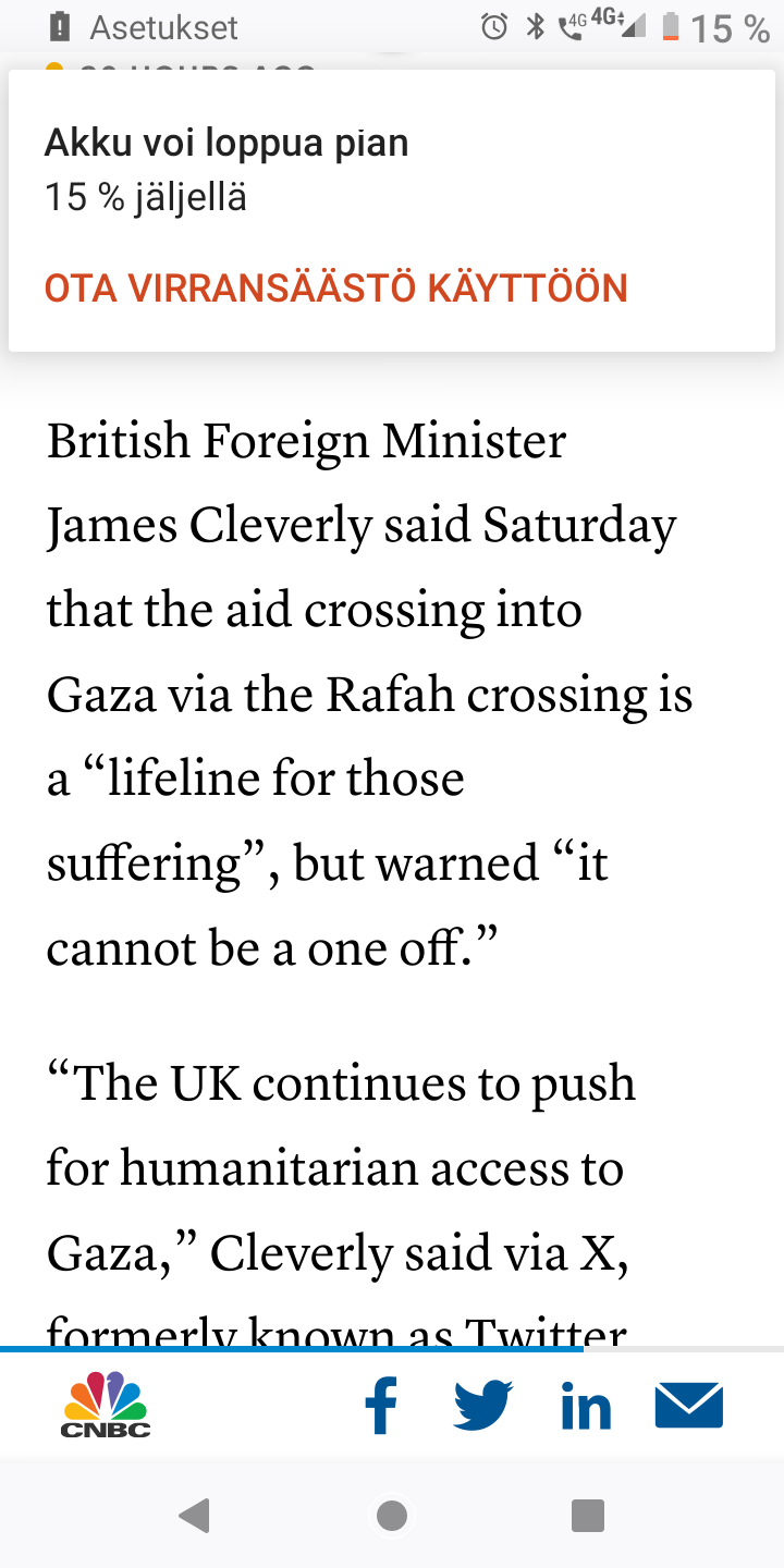 Sanomanetti - Sunnuntai 22.10.2023. ETUSIVU2 - cnbc.com/2023/10/21/israel-hamas-war-updates FRI, OCT 20 2023 2:04 PM EDT --- 21 HOURS AGO --- 18 HOURS AGO FRI, OCT 20 2023 2:04 PM EDT --- 21 HOURS AGO --- 18 HOURS <<< >>> --- Torstai 19.10.2023. Arvaa ketkä tai mitkä? SELVIÄVÄT? - METSÄT, RAAKA- AINEET, TALOUS Perjantaina 20.10.2023 klo 18-19 Jämsä, Kahvila-ravintola Akuliina Lauantaina 21.10.2023 klo 10.30-11.30 Konnevesi, Ravintola Mierontie Ravintola Sun Toive klo 14-15 Toivakka, Kahvitarjoilu. TERVETULOA! renew Vastaus täällä! - 20 vuotta sitten. 16.10.2003. Pääkirjoitus. Ylen tv-uutiset valehteli ministerin puheenvuoron! - 20 vuotta sitten. Muut lehdet. Valtio ryssi itse Fortumin Oilin. Taloussanomat. Kolumni. Tapani Pitzen. - 20 vuotta sitten. Viikon kuva. "Nykyaikaista taidepolitiikkaa". Pertti Manninen. --- Tiistai 17.10.2023. Asunnottomien yö 17.10. Arkistosta vuodelta 2005. - Maanantaina 17.10.2005 klo 08:50 Ylen radion aamulähetyksessä puhutaan asunnottomuudesta. Johdanto ja osa alkupuheenvuorosta puuttuu. Muitakin uutisia lopuksi. - Henkilöt esiintymisjärjestyksessä: Nainen: Kati, mies: Reijo, toimittaja: Kari Mäenpää, Ekokolon hoitaja: Markku Heino, Asunnottomien yö-kansalaisliikkeen organisaattori: Antti Honkonen, studiotoimittaja: Petri Kejonen ja kuuluttaja: Maaria Seppänen. Ääninauhalta purkanut Pertti Manninen, Nettisanomat, oikeinkuulemisvarauksin. Kuvat: Ruskea perhonen. Ruusut kukkivat, marjat punertavat ja lehdet vihertävät. --- Maanantai 16.10.2023. Tuuli käy heidän ylitseen. Martti Ahtisaari 1937- 2023. - Google-haku maanantaina 6.10.2023 14:47. Kuvat: Pertti Manninen. - Sunnuntaina 8.10.2023 täällä sivuilla etusivu - v20 - v24. 2008. Rauhanpalkinto 2008. Martti Ahtisaari. Nobelisti mielii yhä Natoon. Lue! 2008. Pääkirjoitus sunnuntaina 12.10.2008. Rauhanpalkintokaan ei rauhoittanut: Martti Ahtisaari haluaa yhä ydinaseita Suomeen. Lue! 2008. Ahtisaari: Suomi tarvitsee Nato-jäsenyyttä. Lue! 2008. Albaaaniperheelle Ahtisaari on rauhantekijä. Lue! 2003. Ahtisaari ei kaipaa todisteita. Lue! 2003. Ahtisaari vaatii puuttumista diktatuureihin. Lue! 25.09.2003. Pääkirjoitus. Uskaltaako Ahtisaari, USA:n juoksupoika mennä Bagdadiin? Lue! 2004. Turkki. Ahtisaari asialla: Kurdit myytävänä. Lue! 1999. Soitellen sotahan: tuho, jonka tahdoimme? Lue! --- Sunnuntai 15.10.2023. Kuvat MTV:n Kymmenen Uutisista 15.10.2023 22:01- 22:03. Gazassa ja Israelissa kuollut yhteensä jo 3750 ihmistä. Kuvat: Pertti Manninen. Sunnuntai 15.10.2023. JATKUU --- Tiistai 10.10.2023. Aleksis Kiven päivä 10.10. "Makeasti oravainen makaa sammalhuoneessansa." Kuva. - Kolme lippua liehuu Kirkkonummen uimahallilla kirjavan koulu taustanaan. Uusimaa. Kirkkonummi. Gesterbyntie. Tiistai 10.10.2023 13:36. Pertti Manninen. - Aleksis Kiven palkinto kirjailija Rosa Liksomille. --- Sunnuntai 8.10.2023. Rauhanpalkinto 2008. Martti Ahtisaari Lue! Rauhanpalkinto 2009. Barack Obama Lue! Rauhanpalkinto 2023. Narges Mohammadi Lue! --- Lauantai 7.10.2023. Rauhanpalkinto 2023. Nobelin rauhanpalkinto iranilaiselle naisten oikeuksien puolustajalle. Palkittu Narges Mohammadi on parhaillaan vangittuna Iranissa. Lehtien sivut perjantaina 6.10.2023 15:54- 16:07. --- Perjantai 6.10.2023. 20 vuotta sitten 25.9.2003. Moe haluatko miljönääriksi ohjelman juontajana. By Matti Reijonen Moe 20 vuotta sitten: 2.10.2023 - 3.10.2023 - 4.10.2023 - 5.10.2023 - 6.10.2023 - --- 20 vuotta sitten 2.10.2003. Pääkirjoitus. Puhetta. "Hyvät maanmiehet, tilanne on vakava. - Pääkirjoituksia. Linkit --- Sunnuntai 1.10.2023. Kurjet lentävät. Uusimaa. Kirkkonummi. Lapinkylä. Kuva Pertti Manninen. --- Lauantai 30.9.2023. Nettisanomat lauantai 2006-11-11. Aivoina Björn Wahlroos ja Ahti Hirvonen Lue! --- Veropakolainen Björn Wahlroos vuosien varrelta. Juoksupojasta pomoksi. --- Keskiviikkona 27.9.2023. Päivälleen 24 vuotta sitten: Katujuopottelu kuriin Helsingissä! Viina virtaa vain aidan sisäpuolella? Lue! - 24 vuotta sitten: torstaina elokuun 12. päivänä 1999 Köyhät opiskelijat, painukaa helvettiin! Ben Zyskowicz. Vertti Kiukas. Janne Virkkunen. ---Tiistaina 26.9.2023. Lähtöä odottaen. Joutsenet pellolla. Uusimaa. Kirkkonummi. Lapinkylä. Maanantai 25.9.2024 15:33. Kuva Pertti Manninen. - Kommentti: Orpo ja Purra yrittävät tökeröä taloustemppua, jolla Reagan ja Thatcherkin saivat aikaan mittavaa vahinkoa. Lue! Kommentti. Jan Hurri. --- Sunnuntaina 24.9.2023. Syksyn lehdet metsäojassa. Uusimaa. Kirkkonummi. Lapinkylä. Sunnuntai 24.9.2024 15:18. Kuva Pertti Manninen. - Näin paljon korkeakoulu- opiskelijoiden talous on heikentynyt: Yliopistoja valtaavien opiskelijoiden huoli on aito. Uusi Suomi. Kommentti. Sonja Mänty. Lue! --- Perjantaina 22.9.2023. Ajankohtaista narutusta? Narutusta Mansessa 2023 Narutusta Moskovassa 2022. - Keskiviikkona 20.9.2023. KALTSIN KALTSIT Valokuvaaja Aulis Nyqvist. - HS: Kirjailija Torsti Lehtinen kuollut - Keskiviikkona 20.9.2023. Niinistön sanoja ja puheita tulkitaan ja ihmetellään. Ilta-Sanomat tiistai 19.9.2023 --- Maanantaina 18.9.2023. Luottamusta. Ulkomaat Niinistö Putin HS 17.9. - Trump Putin Iltalehti 17.9. - Erdogan Ilta-Sanomat 16.9. - Ardern Støre Marin Trudeau HS 17.9.2023. Kotimaa Orpo Iltalehti 15.9. - Orpo Nettisanomat 20.6. Kuvasarja. - Orpo HS 15.9. - Orpo HS 15.9.2023. Luottamusta. --- Sunnuntaina 17.9.2023. Varrella viikon. Luontokuvia. Maanantaina 11.9.2023. ... Kurjet torstaina 14.9.2023 09:31. Uusimaa. Kirkkonummi. Lapinkylä. ---- Tiistaina 12.9.2023. Teuvo Suomisen vaikuttavat kuvat. --- Maanantaina 11.9.2023. Henrik Meinander: Itseään kunnioittava kansakunta ei siivoa historiaansa katukuvasta. HS Mielipide. 9.9.2023. Lue! --- Sunnuntaina 10.9.2023. Arkisto 2005. Tulossa? 19.03.2005. George W. Bush ja Tony Blair sekä Saddam kahleissa. - Leif Salmén. Kolumni. Taas raha puhuu. Iltalehti keskiviikkona 13.4.2005. --- Perjantaina 8.9.2023. Sanna Marin paholaisen palkkalistoille Pääkirjoitus. Perjantai 8.9.2023 20:01 K
