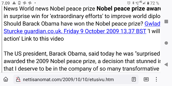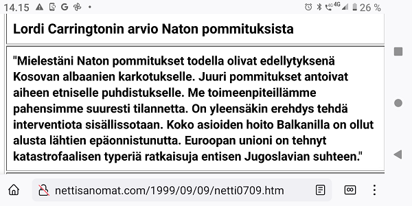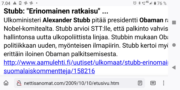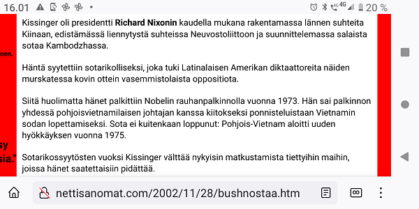 Sunnuntai 8.10.2023. Pääkirjoitus sunnuntaina 2008-10-12. Rauhanpalkintokaan ei rauhoittanut: Martti Ahtisaari haluaa yhä ydinaseita Suomeen. HBL Hufvudstadsbladet. Debatt. Nato. Aktualisera en kärnvapenfri zon igen. Stig Gustafsson. Curt Riberdahl. Tisdag 21 november 2006. (Käännös: Pertti Manninen). Ydinaseeton vyöhyke on tehtävä taas ajankohtaiseksi. Muut lehdet. Keskisuomalainen, ulkomaat perjantaina 29.11.2002. Washington, STT Bush nostaa Henry Kissingerin, 79, takaisin politiikan parrasvaloihin Ahtisaari ei kaipaa todisteita. "Tietäen, että noin miljoona ihmistä on tapettu Irakin hallinnon toimesta, minä en paljon niitä joukkotuhoaseita enää tarvitse." Helsingin Sanomat perjantaina 01.08.2003. Turkki. Ahtisaari asialla: Kurdit myytävänä. "Turkin EU-jäsenyyden edut painavampia kuin haasteet". Täysin kritiikitön ja epämääräistä toimikuntaa esittelemätön kirjoitus Helsingin Sanomissa maanantaina 06.09.2004. Nobelisti mielii yhä Natoon. Albaaaniperheelle Ahtisaari on rauhantekijä. Nobelisti mielii yhä Natoon Linkkejä ja kirjoituksia. 35 kpl http://www.nettisanomat.com/2008/10/12/etusivu.html#linkkeja |