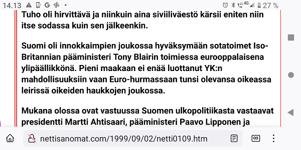 kaikki eivät pimitä! "Tasavallan presidentin ja johtavan hallituspuolueen puheenjohtajan turvallisuuspoliittiset sukset ovat pahasti ristissä. Tämä käy ilmi kahdesta kesällä ilmestyneestä lehtihaastattelusta." Iltalehti. Timo Hakkarainen. Keskiviikko 3.9.2003. Halosen ja Lipposen linjat pahasti ristissä. |