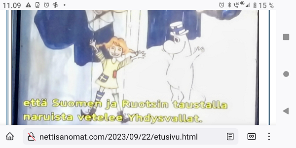 Sunnuntai 15.10.2023. --- MTV:n Kymmenen Uutisista 15.10.2023 22:01- 22:03. Kuvat: Pertti Manninen. Sunnuntai 15.10.2023. |