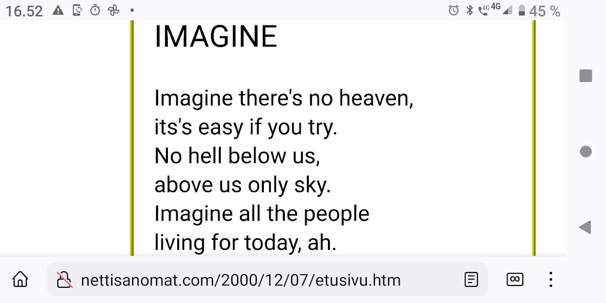 Sanomanetti - Tiistai 24.10.2023. - Arkisto 2000. NETTISANOMAT.COM "YK:n päivänä 2000". - Do You Imagine? 20 vuotta sitten, 8. joulukuuta 1980, hyvästi Uneksitko? - IMAGINE Imagine there's no heaven, its's easy if you try. No hell below us, above us only sky. Imagine all the people living for today, ah. No hell below us, above us only sky. Imagine all the people living for today, ah. Imagine there's no countries, it isn't hard to do. Nothing to kill or die for and no religion too. Imagine all the people living life in peace. You, you may say I'm a dreamer, but I'm not the only one. I hope some day you'll join us and the world will be as one. Imagine no possessions, I wonder if you can. No need for greed or hunger, a brotherhood of man. Imagine all the people sharing all the world. You, you may say I'm a dreamer, but I'm not the only one. I hope some day you'll join us and the world will live as one. - Imagine 1971, Lennonin viidennellä soololevyllä, - UNEKSI Uneksi! Ei taivasta, helppoa, eikö niin? Ei helvettiä, yllämm' vain avaruus. Uneksi! Ihmiskunta hyväks' päivän tään. Ei helvettiä, yllämm' vain avaruus. Uneksi! Ihmiskunta hyväks' päivän tään. Uneksi! Ei valtioita, ei liene vaikeaa. Ei enää tappamista, ei uskontoakaan. Uneksi! Ihmiskunta elää rauhassaan. Sanot: Olen uneksija, vaan en suinkaan ainoa. Mukaan toivon sinutkin, maailma yhteen sulaa. Uneksi! Ei alistusta, pystytkö tähänkin? Ei puutetta ja nälkää, veljeys kunniaan. Uneksi! Ihmiskunta jakaa yhdess' maan. Sanot: Olen uneksija, vaan en suinkaan ainoa. Mukaan toivon sinutkin, maailma yhdess' elää. - Imagine 1971, Lennonin viidennellä soololevyllä, Suomentanut Pertti Manninen tammikuussa 2000. --- Kuvia YK:n päivänä 2023. 08:33 Aurinko nousee muutaman hetken kuluttua. Uusimaa. Kirkkonummi. Kauhala. Tiistai 24.10.2023 08:33. Kuva Pertti Manninen. Kuvia YK:n päivänä 2023. Aamusta illansuuhun 08:33 - 15:59. Uusimaa. Kirkkonummi. Tiistai 24.10.2023. Kuvat Pertti Manninen. 18 kuvaa! Tiistai 24.10.2023. 19:51. Kaksi kuvaa Jopet-showsta vuodelta 2007. - Mutta miksi näitä ydinaseita ei poisteta kokonaan? - No on puhuttu niiden vaihtamisesta ritsoihin. Kaksi kuvaa Jopet-showsta vuodelta 2007. Kuvia YK:n päivänä 2023. Jope Ruonansuu, Mika Räinä ja Jukka Toivonen. Yle TV2 tiistaina 24.10.2023 19:51. Kuvat Pertti Manninen. Tiistai 24.10.2023. 21:55. YK:n päivänä 2023. Israel vaatii YK:n pääsihteerin eroa. Iltalehti. Guterresin mukaan lokakuun 7. päivän hyökkäys ei tullut tyhjästä, ja että palestiinalaiset ovat olleet 56 vuotta "tukahduttavan miehityksen" kohteena. YK-järjestö saattaa joutua lopettamaan avustustoimintansa Gazassa. "Jos emme saa polttoainetta" Iltalehti 24.10.2023 21:55. Kuvat Pertti Manninen. --- Tiistai 17.10.2023. Asunnottomien yö 17.10. Arkistosta vuodelta 2005. --- Tiistai 10.10.2023. Aleksis Kiven päivä 10.10. "Makeasti oravainen makaa sammalhuoneessansa." Kuva. --- --- Lauantai 7.10.2023. Rauhanpalkinto 2023. Nobelin rauhanpalkinto iranilaiselle naisten oikeuksien puolustajalle. Palkittu Narges Mohammadi on parhaillaan vangittuna Iranissa. --- Perjantai 6.10.2023. 20 vuotta sitten 25.9.2003. Moe haluatko miljönääriksi ohjelman juontajana. By Matti Reijonen Moe 20 vuotta sitten: 2.10.2023 - 3.10.2023 - 4.10.2023 - 5.10.2023 - 6.10.2023 - --- Sunnuntai 1.10.2023. Kurjet lentävät. Kuva Pertti Manninen. --- Nettisanomat 20 vuotta sitten 28.8.2003. I have a dream.Keskiviikkona 16.8.2023. Arkisto 20 vuotta sitten 14.8.2003. - USA. Hullut vaalit. - Valtauksen merkki. Vaikea kuva 2003. 10.04.2003. Kaleva. - Ahtisaari ei kaipaa todisteita. 01.08.2003. --- Sunnuntaina 13.8.2023. Uusi sukupolvi hippasilla. Kuva. --- Arkisto 6.9.2001. Pääkirjoitus. --- SYYSKUU 2016. ORAVA TAMMESSA. - Vuosisadan kuva: Sirkka Hämäläinen, Sauli Niinistö, Johnny Åkerholm. - SMILE from MODERN TIMES - "Förbjud atomvapnen". 1957 KUVA - "YK:n päivä 2000" - Tiistai 24.10.2023. - Kuvasanomat - Sanomatori - Viikkosanomat - Härkää sarvista - 12.fi -