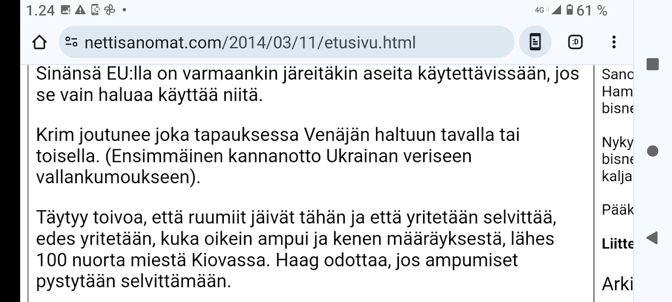 SANOMANETTI - N:o 2878 - Maanantai 26.02.2024 - Ukraina. Ylen aamu-uutiset 24.2.2022 ja 24.2.2024 puheentunnistuksella. Krim maaliskuussa 2014. - Jäädytetäänkö Harkimonkin rahavarat? Rahanpesuepäilyt liippaavat läheltä. Lue! - Kohudosentti Johan Bäckman todisteli vaalien "laillisuutta" - Obama kovisteli Putinia: Emme ikinä tunnusta kansanäänestystä - Suomen ulkopoliittinen johto: "Krimin kansanäänestys laiton" - Ukrainalaispoika palautti Putinin antaman lahjakellon. Otsikot - Ukraine - Referendum - Sanctions - Alibaba. Kuvat - Niinistö tapasi Kiinan presidentin. Kuvat. - Arkisto. 2006. Verenpunainen syksy Suomessa ja maailmalla. Toimittaja tapetaan Venäjällä. Joka 40. irakilainen on kuollut vuoden 2003 hyökkäyksen jälkeen sodan jaloissa. Elämme veristä aikaa. Linkkejä: Leader: In praise of Politkovskaya Obituary: Anna Politkovskaya - '655,000 Iraqis killed since 2003' One in 40 'killed since invasion' - Nämä lehdestä Guardian Unlimited, jonka arkistot ovat avoinna, toivottavasti vielä vuosien päästä. Pääkirjoitus. Nettisanomat perjantai 2006-10-13. Pertti Manninen. --- Keskiviikko 21.02.2024 - The Guardian Wed 21 Feb 2024 Barely 10% of Europeans believe Ukraine can still defeat Russia, finds poll. https://www.theguardian.com/world/