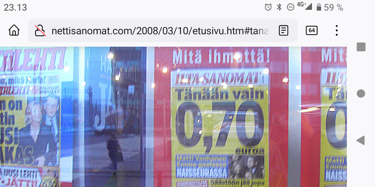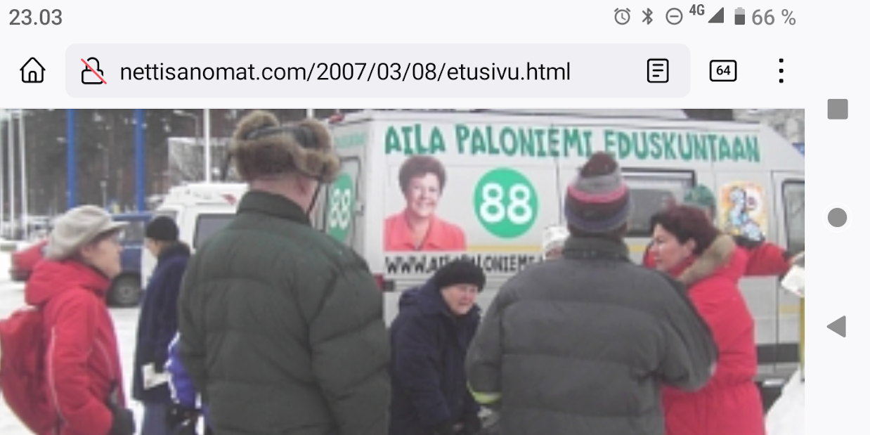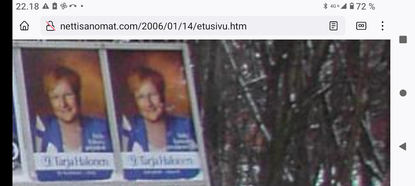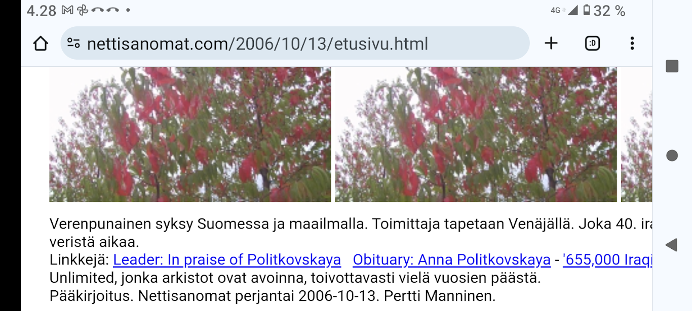 SANOMANETTI - N:o 2887 - 20 vuotta sitten 11.3.2004. - Arkisto Madrid 11. maaliskuuta 2004. Hirveitä pommiräjähdyksiä työmatkajunissa. Lähes 200 kuollutta tuhoisassa terrori-iskussa tänään torstaina 11. maaliskuuta 2004. Kuva: "Tuuli käy heidän ylitseen." --- Sunnuntai 10.09.2024 - Arkisto 1999. NYKYAIKA CHARLES CHAPLIN 1936 Nykyaika nyt! Tule tekemään yhteisen tajun kokemusta! Versio 1.0 on nyt valmis. NYKYAIKA CHARLES CHAPLIN 1936 perjantaina 26.11.99 tiistaina 30.11.99. --- Lauantai 09.03.2024 - Työtä! Pääkirjoitus. - Kuva. Kahdessa kerroksessa. Linnutkin kahdessa kerroksessa. Ne, jotka pystyvät syömään suoraan ja ne, jotka joutuvat odottamaan ylempää pudonneita murusia, kyllähän täytettäessä heillekin tulee siroteltua, suoraan. Uusimaa. Kirkkonummi. Björkdal. Perjantai 08.03.2024 11:06. Kuva Pertti Manninen. --- Perjantai 08.03.2024 - Kansainvälinen naistenpäivä, perjantai, 8. maaliskuuta. Kansainvälisen naistenpäivän pyöräilyä kirkkaan kirpeänä pakkaspäivänä Suomessa. 08.03.2006 maaliskuun keskiviikkona klo 15.13. Kuva Pertti Manninen, Jyväskylä. /2006/03/08/etusivu.htm. - Naisten palkkaa, veroalea ja Lipposen Stasi-kantaa sekä Ruotsin hallituksen toimintaa Irak-asiassa! Tulossa! Kuvat Pertti Manninen. ... Kuva 08.03.2006. "Naisen palkka 1". Iltalehti. Kolumni. Kalle Isokallio. Maanantaina 06.03.2006. Myyttejä ja mainoslauseita. Kuva 08.03.2006. " Naisen palkka 2". Aamulehti. Kotimaa. Keskiviikkona 08.03.2006. Kun mies ansaitsee euron, nainen saa 96-97 senttiä. Kuva 08.03.2006. "Naisen palkka 3". Aamulehti. 3. pääkirjoitus. Keskiviikkona 08.03.2006. Jatkuvaa palkkahurskastelua. Aamulehden vastaava päätoimittaja on Matti Apunen. - Elokuvalipulla kohtuuton hinta. --- Torstai 07.03.2024 - Päivän pienimmät. Metsämyyrät puikkelehtivat tammen ympärillä aurinkoisessa iltapäivässä. Uusimaa. Kirkkonummi. Björkdal. Torstai 7.3.2024 16:30. Kuva Pertti Manninen. - Valitut viikot. 2000-2024. Maaliskuun alku. 2000. Nihkeä Niinistö. Kuvasarja --- Tiistai 05.03.2024 Päivän pupu - Vielä vaalea pupu syömässä auringonkukan siemeniä illan hämärässä. Uusimaa. Kirkkonummi. Björkdal. Tiistai 5.3.2024 17:55. Kuva Pertti Manninen. --- Sunnuntai 03.03.2024 - "Sinä lähdit pois ... Minä katselin parvekkeelta, Loittonevaa selkääsi, Kiersit vesilammikot, Ja arvaan ettet murehdi tätä eroa, eroa, eroa." - Kansa hurrasi presidenttiparille "Kiitos Sauli Kiitos Jenni" - Iltalehden lööppi Lapinkylän kyläkaupan ovella sunnuntaina 3.3.2024 15:51. Pertti Manninen. --- Perjantai 01.03.2024 - Tässä ajassa ja ympäristössä 1. maaliskuuta 2024. Vaihto. - Yle teksti-tv 01.03. 11:53:23 Stubb aloittaa presidenttikautensa - Gazan verilöyly halutaan tutkia - Navalnyi haudataan Moskovassa - Tulivuoriturman uhreille korvauksia - Kriznar voittoon, Rautionaho viides - Sähkön hinta 12:02:27 Yle teksti-tv 01.03. 12:08:51 Kotimaa Perjantai - Stubb aloittaa presidenttikautensa - Koirat pidettävä kytkettyinä - STM: Syyhyhoitoon etsitään keinoja - Nylon Beat tekee paluun kesällä - Talvi oli tavanomaista kylmempi - Torstain uutisia: "Lakkolait" etenevät eduskuntaan - Turkistarhoille miljoonakorvaukset - Suomessa paikallisia syyhyryppäitä - Koirat pidettävä kytkettyinä - STM: Syyhyn hoitoon etsitään keinoja - Nylon Beat tekee paluun kesällä - Talvi oli tavanomaista kylmempi - "Lakkolait" etenevät eduskuntaan - Turkistarhoille miljoonakorvaukset - Suomessa paikallisia syyhyryppäitä - Sähköpotkulaudoille liikennevakuutus - Yle teksti-tv 01.03. 12:12:18 Navalnyi haudataan Moskovassa - uusittu 12.05 - Iranissa tänään parlamenttivaalit - Tulivuoren turman uhreille korvauksia - Gazan verilöyly halutaan tutkia - Biden ja Trump Texasissa - USA vältti hallinnon sulun - Torstain uutisia - Ruotsissa pysäytettiin reaktori - Navalnyin ruumiille ei kuljetusta - YK:n turvallisuusneuvosto koolle - Norjan kuningas kuljetetaan kotiin - Navalnyi haudataan Moskovassa - Iranissa tänään parlamenttivaalit - Tulivuoriturman uhreille korvauksia - Gazan verilöylystä halutaan tutkinta - Biden ja Trump Texasissa - USA vältti hallinnon sulun - Ruotsissa pysäytettiin reaktori - Navalnyin ruumiille ei kuljetusta - YK:n turvallisuusneuvosto koolle - Norjan kuningas Harald kotiin pian - Yle teksti-tv 01.03. 12:14:51 - Inflaatio EU-säännöin 1,2 % - Olkiluoto 3 vuosihuoltoon huomenna - Bitcoin nousee hyvästä syystä - Korot ja valuuttakurssit - Maailman pörssien kursseja - Pörssisähkön hinta Olkiluoto 3 ensimmäiseen vuosihuoltoon - EU-säännöin laskettu inflaatio 1,2 % - Bitcoin nousee, ja siihen on syy - Yle teksti-tv 01.03. 12:17:51 To 29.2. EKP:n kursseja - Finland has not set limits on use of weapons sent to Ukraine - Employment Fund to shrink staff due to adult-education budget cuts - Israeli embassy in Helsinki splattered with red liquid - Tässä ajassa ja ympäristössä 1. maaliskuuta 2024. Vaihto JA DOT - Yle.fi Kuvat perjantaina 1.3.2024 11:53- 12:22 ja viimeinen 12:42. Ruudulta Pertti Manninen. --- Keskiviikko 28.02.2024 --- Maanantai 26.02.2024 - - Arkisto. 2006. Verenpunainen syksy Suomessa ja maailmalla. Toimittaja tapetaan Venäjällä. Joka 40. irakilainen on kuollut vuoden 2003 hyökkäyksen jälkeen sodan jaloissa. Elämme veristä aikaa. Linkkejä: Leader: In praise of Politkovskaya Obituary: Anna Politkovskaya - '655,000 Iraqis killed since 2003' One in 40 'killed since invasion' --- Keskiviikko 21.02.2024 - The Guardian Wed 21 Feb 2024 Barely 10% of Europeans believe Ukraine can still defeat Russia, finds poll. https://www.theguardian.com/world/