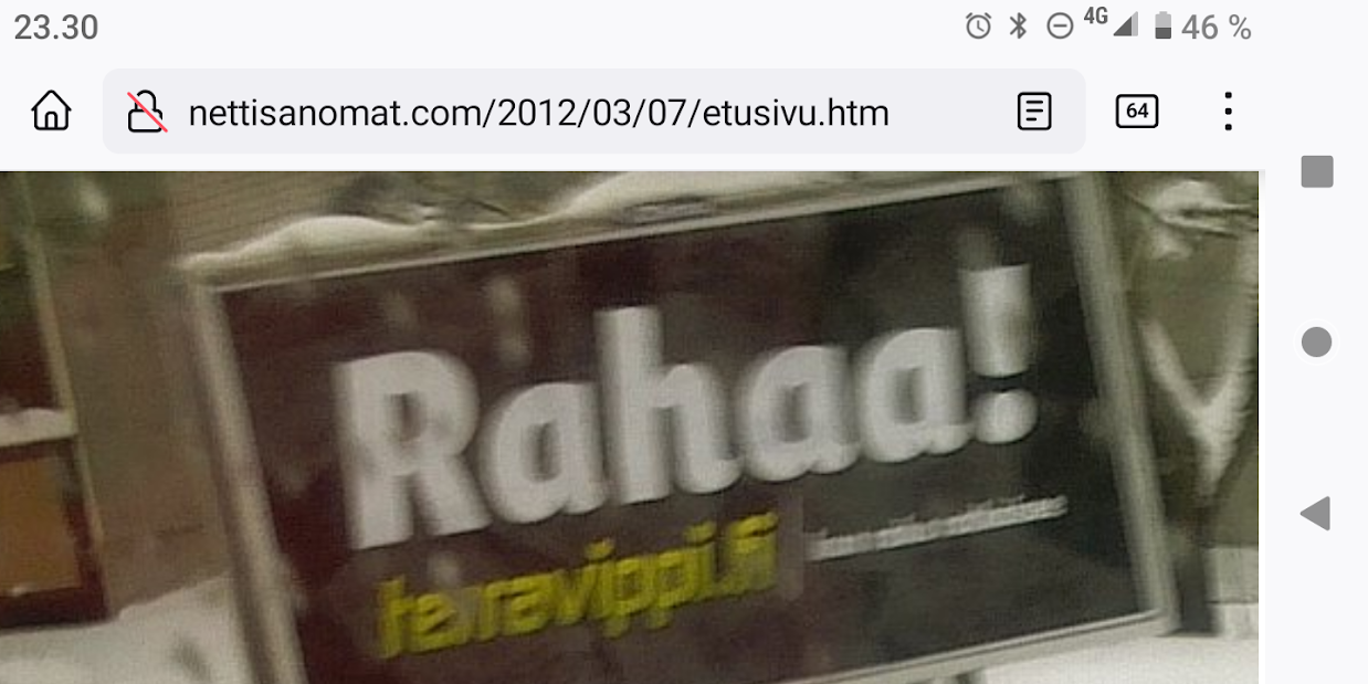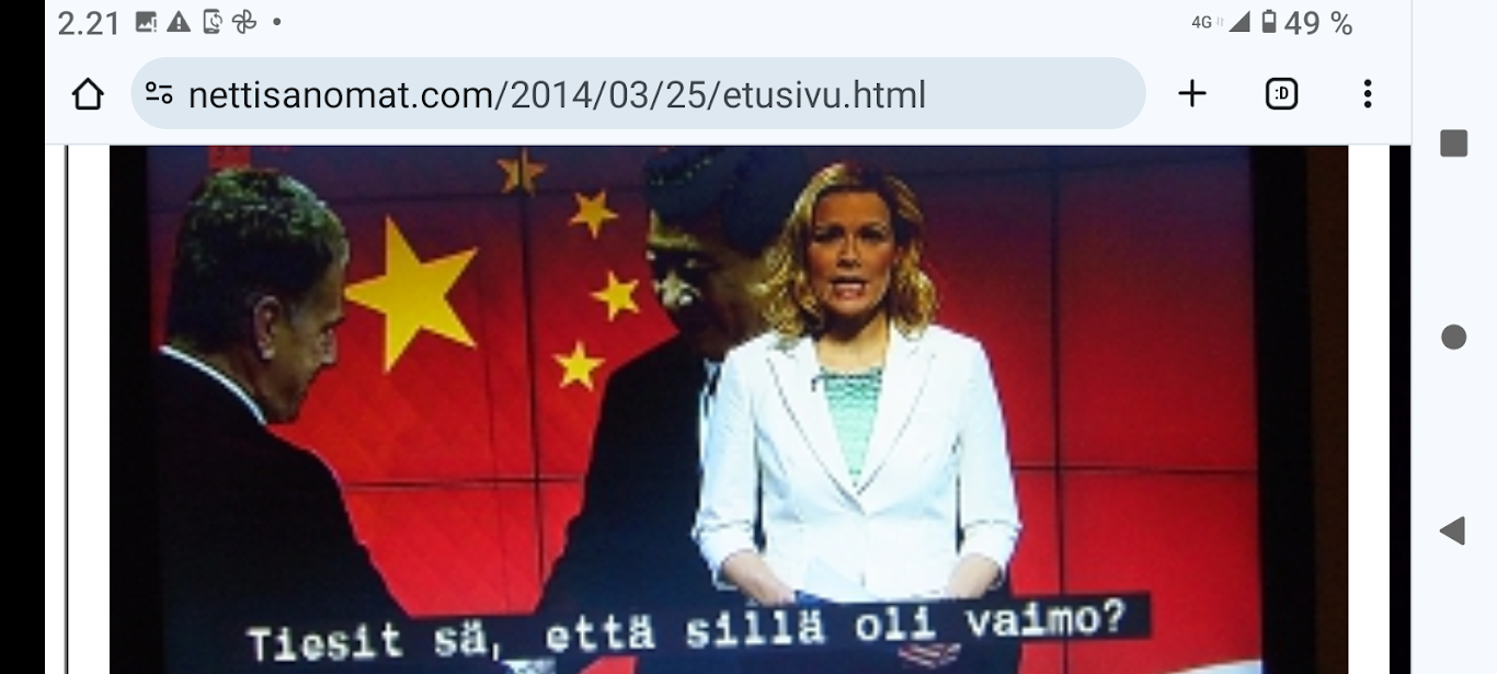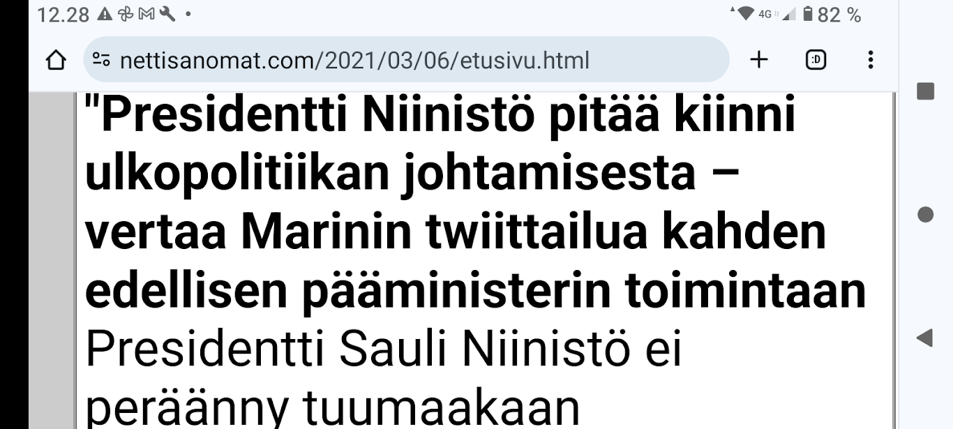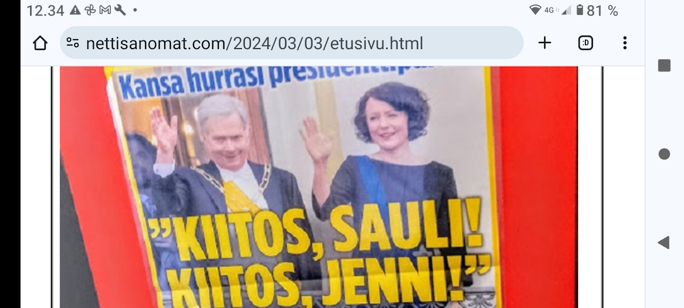 SANOMANETTI - N:o 2887 - 20 vuotta sitten 11.3.2004. - Arkisto Madrid 11. maaliskuuta 2004. Hirveitä pommiräjähdyksiä työmatkajunissa. Lähes 200 kuollutta tuhoisassa terrori-iskussa tänään torstaina 11. maaliskuuta 2004. Kuva: "Tuuli käy heidän ylitseen." --- Sunnuntai 10.09.2024 - Arkisto 1999. NYKYAIKA CHARLES CHAPLIN 1936 Nykyaika nyt! Tule tekemään yhteisen tajun kokemusta! Versio 1.0 on nyt valmis. NYKYAIKA CHARLES CHAPLIN 1936 perjantaina 26.11.99 tiistaina 30.11.99. --- Lauantai 09.03.2024 - Työtä! Pääkirjoitus. - Kuva. Kahdessa kerroksessa. Linnutkin kahdessa kerroksessa. Ne, jotka pystyvät syömään suoraan ja ne, jotka joutuvat odottamaan ylempää pudonneita murusia, kyllähän täytettäessä heillekin tulee siroteltua, suoraan. Uusimaa. Kirkkonummi. Björkdal. Perjantai 08.03.2024 11:06. Kuva Pertti Manninen. --- Perjantai 08.03.2024 - Kansainvälinen naistenpäivä, perjantai, 8. maaliskuuta. Kansainvälisen naistenpäivän pyöräilyä kirkkaan kirpeänä pakkaspäivänä Suomessa. 08.03.2006 maaliskuun keskiviikkona klo 15.13. Kuva Pertti Manninen, Jyväskylä. /2006/03/08/etusivu.htm. - Naisten palkkaa, veroalea ja Lipposen Stasi-kantaa sekä Ruotsin hallituksen toimintaa Irak-asiassa! Tulossa! Kuvat Pertti Manninen. ... Kuva 08.03.2006. "Naisen palkka 1". Iltalehti. Kolumni. Kalle Isokallio. Maanantaina 06.03.2006. Myyttejä ja mainoslauseita. Kuva 08.03.2006. " Naisen palkka 2". Aamulehti. Kotimaa. Keskiviikkona 08.03.2006. Kun mies ansaitsee euron, nainen saa 96-97 senttiä. Kuva 08.03.2006. "Naisen palkka 3". Aamulehti. 3. pääkirjoitus. Keskiviikkona 08.03.2006. Jatkuvaa palkkahurskastelua. Aamulehden vastaava päätoimittaja on Matti Apunen. - Elokuvalipulla kohtuuton hinta. --- Torstai 07.03.2024 - Päivän pienimmät. Metsämyyrät puikkelehtivat tammen ympärillä aurinkoisessa iltapäivässä. Uusimaa. Kirkkonummi. Björkdal. Torstai 7.3.2024 16:30. Kuva Pertti Manninen. - Valitut viikot. 2000-2024. Maaliskuun alku. 2000. Nihkeä Niinistö. Kuvasarja --- Tiistai 05.03.2024 Päivän pupu - Vielä vaalea pupu syömässä auringonkukan siemeniä illan hämärässä. Uusimaa. Kirkkonummi. Björkdal. Tiistai 5.3.2024 17:55. Kuva Pertti Manninen. --- Sunnuntai 03.03.2024 - "Sinä lähdit pois ... Minä katselin parvekkeelta, Loittonevaa selkääsi, Kiersit vesilammikot, Ja arvaan ettet murehdi tätä eroa, eroa, eroa." - Kansa hurrasi presidenttiparille "Kiitos Sauli Kiitos Jenni" - Iltalehden lööppi Lapinkylän kyläkaupan ovella sunnuntaina 3.3.2024 15:51. Pertti Manninen. --- Perjantai 01.03.2024 - Tässä ajassa ja ympäristössä 1. maaliskuuta 2024. Vaihto. - Yle teksti-tv 01.03. 11:53:23 Stubb aloittaa presidenttikautensa - Gazan verilöyly halutaan tutkia - Navalnyi haudataan Moskovassa - Tulivuoriturman uhreille korvauksia - Kriznar voittoon, Rautionaho viides - Sähkön hinta 12:02:27 Yle teksti-tv 01.03. 12:08:51 Kotimaa Perjantai - Stubb aloittaa presidenttikautensa - Koirat pidettävä kytkettyinä - STM: Syyhyhoitoon etsitään keinoja - Nylon Beat tekee paluun kesällä - Talvi oli tavanomaista kylmempi - Torstain uutisia: "Lakkolait" etenevät eduskuntaan - Turkistarhoille miljoonakorvaukset - Suomessa paikallisia syyhyryppäitä - Koirat pidettävä kytkettyinä - STM: Syyhyn hoitoon etsitään keinoja - Nylon Beat tekee paluun kesällä - Talvi oli tavanomaista kylmempi - "Lakkolait" etenevät eduskuntaan - Turkistarhoille miljoonakorvaukset - Suomessa paikallisia syyhyryppäitä - Sähköpotkulaudoille liikennevakuutus - Yle teksti-tv 01.03. 12:12:18 Navalnyi haudataan Moskovassa - uusittu 12.05 - Iranissa tänään parlamenttivaalit - Tulivuoren turman uhreille korvauksia - Gazan verilöyly halutaan tutkia - Biden ja Trump Texasissa - USA vältti hallinnon sulun - Torstain uutisia - Ruotsissa pysäytettiin reaktori - Navalnyin ruumiille ei kuljetusta - YK:n turvallisuusneuvosto koolle - Norjan kuningas kuljetetaan kotiin - Navalnyi haudataan Moskovassa - Iranissa tänään parlamenttivaalit - Tulivuoriturman uhreille korvauksia - Gazan verilöylystä halutaan tutkinta - Biden ja Trump Texasissa - USA vältti hallinnon sulun - Ruotsissa pysäytettiin reaktori - Navalnyin ruumiille ei kuljetusta - YK:n turvallisuusneuvosto koolle - Norjan kuningas Harald kotiin pian - Yle teksti-tv 01.03. 12:14:51 - Inflaatio EU-säännöin 1,2 % - Olkiluoto 3 vuosihuoltoon huomenna - Bitcoin nousee hyvästä syystä - Korot ja valuuttakurssit - Maailman pörssien kursseja - Pörssisähkön hinta Olkiluoto 3 ensimmäiseen vuosihuoltoon - EU-säännöin laskettu inflaatio 1,2 % - Bitcoin nousee, ja siihen on syy - Yle teksti-tv 01.03. 12:17:51 To 29.2. EKP:n kursseja - Finland has not set limits on use of weapons sent to Ukraine - Employment Fund to shrink staff due to adult-education budget cuts - Israeli embassy in Helsinki splattered with red liquid - Tässä ajassa ja ympäristössä 1. maaliskuuta 2024. Vaihto JA DOT - Yle.fi Kuvat perjantaina 1.3.2024 11:53- 12:22 ja viimeinen 12:42. Ruudulta Pertti Manninen. --- Keskiviikko 28.02.2024 --- Maanantai 26.02.2024 - - Arkisto. 2006. Verenpunainen syksy Suomessa ja maailmalla. Toimittaja tapetaan Venäjällä. Joka 40. irakilainen on kuollut vuoden 2003 hyökkäyksen jälkeen sodan jaloissa. Elämme veristä aikaa. Linkkejä: Leader: In praise of Politkovskaya Obituary: Anna Politkovskaya - '655,000 Iraqis killed since 2003' One in 40 'killed since invasion' --- Keskiviikko 21.02.2024 - The Guardian Wed 21 Feb 2024 Barely 10% of Europeans believe Ukraine can still defeat Russia, finds poll. https://www.theguardian.com/world/