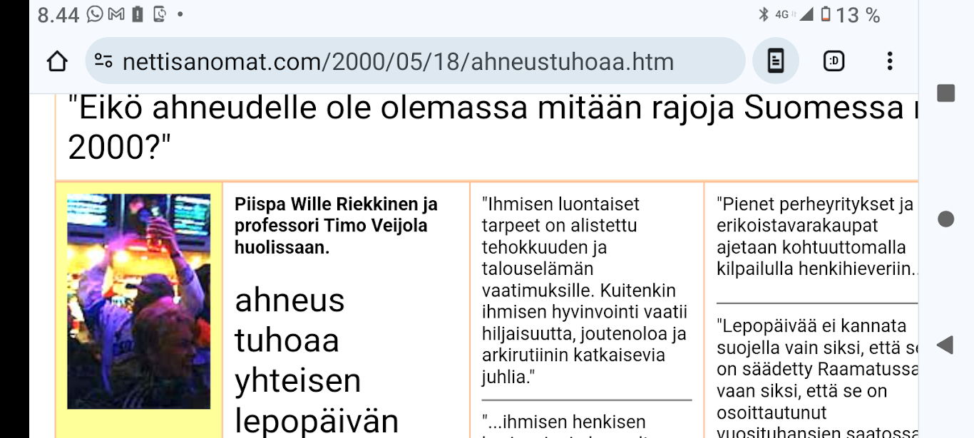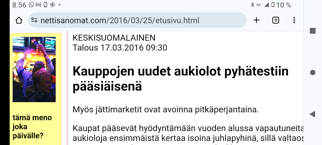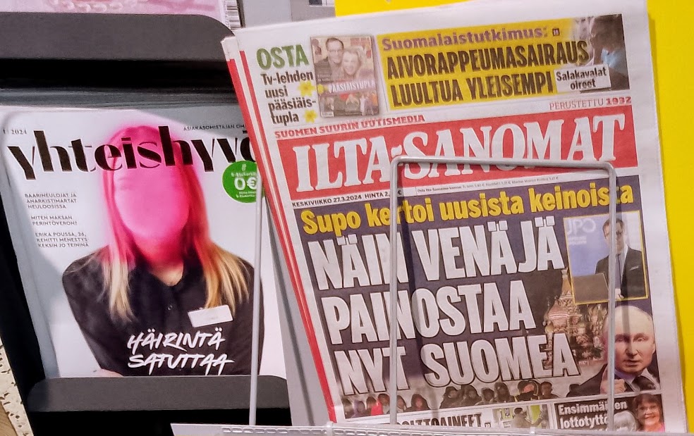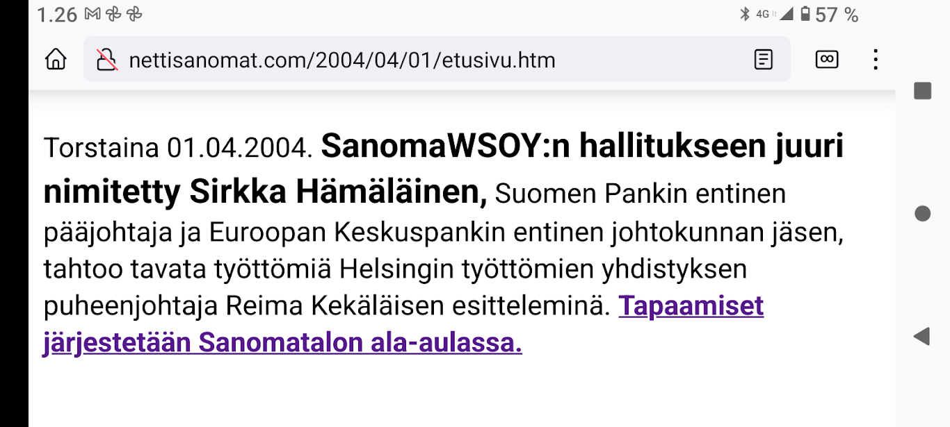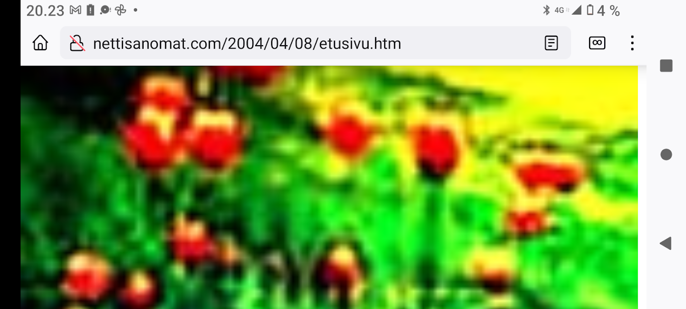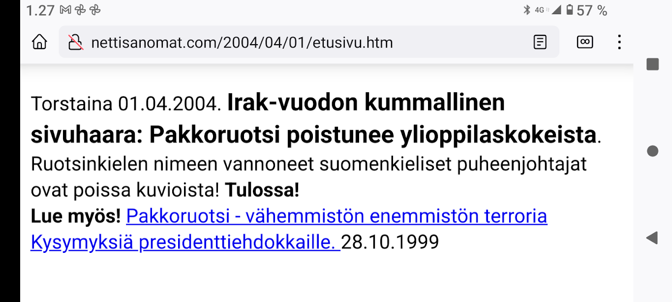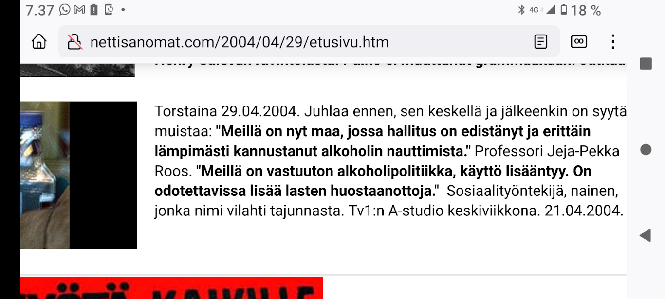SANOMANETTI - N:o 2901 - Maanantai 08.04.2024. Kuvat. - Romanien kansallispäivän liputusta. Espoon Ikeassa maanantaina 8.4.2024 10:14. Kuvat Pertti Manninen. - Liputtomuutta. Keski-Espoon uimahallilla ja Kuninkaantien lukiolla maanantaina 8.4.2024 14:05. Kuva Pertti Manninen. - Ilta-Sanomat. Kotimaa. 8.4.2024. "Sisäministeriö suosittaa yleistä liputusta tänään maanantaina romanien kansallispäivän kunniaksi. Romanien kansallispäivä on ollut suositeltu liputuspäivä Suomessa vuodesta 2014 lähtien, kun Helsingin yliopiston almanakkatoimisto hyväksyi romanien kansallispäivän kalenteriin. Kansainvälisen romanipäivän tarkoituksena on kunnioittaa romanien kulttuuria ja kieltä osana eurooppalaista kulttuuriperintöä. Kansainvälinen romanipäivä sai alkunsa vuonna 1971 Lontoossa pidetystä romanien ensimmäisestä kansainvälisestä kongressista. Sen avajaispäivää 8. huhtikuuta on vuodesta 1990 lähtien vietetty kansainvälisenä romanipäivänä." --- Keskiviikko 3.4.2024 - Kuvia huhtikuussa. 1.4.2024. Kyyhkynen nokkii jyviä. Uusimaa. Kirkkonummi. Björkdal. - 1.4.2024. "Rauhan ja veljeyden merkkinä." IRR-TV:n pääsiäiskonsertti. - 2.4.2024 Tiistaina. "Tuuli käy heidän ylitseen." Vantaan koulusurman uhrin muistolle. Kuva. Sarja "Tuuli käy heidän ylitseen. Kuvat Pertti Manninen. - 2.4.2024 Tiistaina. Potkulaudat tulevat tännekin. Uusimaa. Kirkkonummi. Keskusta. - Tiistaina. Maailman menoa ja tuloa. Otsikoita. Uusimaa. Kirkkonummi. CM. - 2.4.2024 Tiistaina. Vandaalien jäljiltä. Bussikatoksen molempien päätyjen ikkunalasit on hajotettu, tässä eteläinen. Uusimaa. Kirkkonummi. Jokiniemi. Uimahallin ja koulujen pysäkki. - 3.4.2024 Keskiviikkona. Lumestakin löytää syötävää. Lumimyrskyn jälkeen syöttöpaikalla on vilskettä aamusta iltaan. Uusimaa. Kirkkonummi. Björkdal. Keskiviikko 3.4.2024 08:34 ja 14:28 sekä 17:43 jolloin kyyhkynenkin hetken paikalla viihtyi. Pertti Manninen --- 28.3.2024 Kiirastorstai - Tuhteja lukupaketteja Kiirastorstaina Ilta-Sanomat ja Iltalehti. Uusimaa. Kirkkonummi. Tokmanni torstaina 28.3.2024 11:31. Kuva. Pertti Manninen. 3. tuhti lukupaketti kiirastorstaina 2000. Eikö ahneudelle ole olemassa mitään rajoja Suomessa riemuvuonna 2000? Ahneus tuhoaa yhteisen lepopäivän Piispa Wille Riekkinen ja professori Timo Veijola. Lue! 2004. Tutkija vaatii viinaveron nostoa heti. - Kotihälytykset lisääntyneet jopa viidenneksen viimevuodesta "Viisas hallitus päättää heti viinaveron korottamisesta kymmenellä prosentilla tutkimusprofessori Matti Rimpelä Lue! 2004. "Meillä on nyt maa, jossa hallitus on edistänyt ja erittäin lämpimästi kannustanut alkoholin nauttimista." - "Meillä on vastuuton alkoholi-politiikka, käyttö lisääntyy. On odotettavissa lisää lasten huostaan-ottoja." Professori Jeja-Pekka Roos ja sosiaalityöntekijä, jonka nimi vilahti ruudussa. Lue! 2012. Matti Vanhanen alkoholi-kuolemien isä. Vanhasen hallituksen vastuuton alkoholi-politiikka toteutunut karmaisevasti. Päätoimittaja Pertti Manninen. Lue! 2012. Ryyppämisen haitat viisinkertais-tuivat Suomessa 20 vuodessa. Professori Ilkka Vohlonen. Keskisuomalainen sunnuntaina 21.10.2012. Tero Karjalainen. Lue! 2016. Kauppojen uudet aukiolot pyhätestiin pääsiäisenä. Jorma Rahkonen, Pipsa Olli KESKISUOMALAINEN Talous 17.03.2016 Lue! Kiirastorstaina 28.3.2024 2024. Lapsille alkoholin vapauttamisesta on pelkkää haittaa. Keskustelua käydään kuin lapsia ei olisi olemassakaan. Lapsiasiavaltuutettu Elina Pekkarinen ja ehkäisevän päihdetyön järjestöverkoston koordinaatioyksikön päällikkö Kim Kannussaari. Mielipide. Keskisuomalainen torstaina 28.3.2024. 2024. Pääministeri Petteri Orpo valtiovarain-ministeri Riikka Purra, sosiaali- ja terveysministeri Sanni Grahn-Laasonen opetusministeri Anna-Maja Henriksson ja maa- ja metsätalous-ministeri Sari Essayah kristilliset! Tämä oli 3. tuhti lukupaketti kiirastorstaina 2024. 28.03.2024. --- Kuvat. Etelään. Uusimaa. Kirkkonummi. Veikkola keskiviikkona 27.3.2024 14:50. Kuva Pertti Manninen ohi kiitävänä hetkenä. - Idästä. Yhteishyvä. Ilta-Sanomat. Supo kertoi uusista keinoista. Näin Venäjä painostaa nyt Suomea. - Idässä. Iltalehti. Villi teoria Moskovan iskusta. Näin Putin hyötyy. Näin rappeuttava aivosairaus iskee. - Yhteishyvä. Ilta-Sanomat. Iltalehti. Uusimaa. Kirkkonummi. Veikkola. S-Market keskiviikkona 27.3.2024 14:52. Kuva Pertti Manninen hiukan pysähtyneenä. 26.3.2024. --- Kuvat. Ensimmäiset. Ensimmäiset kurjet. Uusimaa. Kirkkonummi. Kauhala tiistaina 26.3.2024 08:30. Kuva Pertti Manninen. Ensimmäiset joutsenet . Uusimaa. Kirkkonummi. Juusjärvi tiistaina 26.3.2024 13:59. Kuva Pertti Manninen. "Minulle ensimmäiset. Eilen tosin näin kurkiauran ja kuulin ääntelyn täällä Kirkkonummen Bjorkdalissa, mutten kuvaa ehtinyt ottamaan." --- 25.03.2024 - Kuvat. Luonnon salaisuudet Yhteisnäyttely 22.3 - 11.4 Tämä näyttely on koottu Kirkkojärven koulun 7a:n ja 8 lk:n valinnaisryhmien ja Lagstadin koulun valinnaisryhmän (8-9) kuvataiteen töistä. Teemana ovat olleet kasvit ja eläimet. Lagstadin koulun oppilaat ovat toteuttaneet työnsä linokaiverrus-painotekniikalla. Kirkkojärven koulussa työt on tehty ryhmässä maalaamalla erilaisin peitevärein sekä mustalle että valkoiselle paperille. Uusimaa. Espoo. Keskus. Uimahalli - Kuninkaantien lukio maanantaina 25.3.2024 14:06. --- Kuvat Pertti Manninen. 22.03.2024. Kuva. Vielä hanki kantaa. Uusimaa, Kirkkonummi. Lapinkylä perjantaina 22.3.2024 16:33. - Arkisto. 20 vuotta sitten 25.03.2004. SanomaWSOY:n tekemä rikos jäi selvittämättä! Irak-vuoto-asiakirjat olivat Helsingin käräjäoikeuden päätöksen mukaan salaisia. Ilta-Sanomat julkisti niitä kuitenkin neljään eri kertaan.--- 21.03.2024. Poliitikko Helsingin Sanomat keskiviikkona 20.3.2024. Arja Alho 70 vuotias. Arja Alho jaksaa yhä rauhan asiaa. "Militaristisina aikoina se ei toden totta ole valtavirtaa." Tulossa! - Pääkirjoitus. Pysäyttäkä