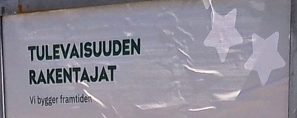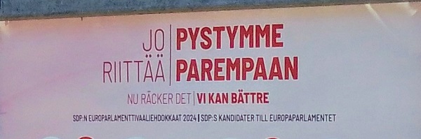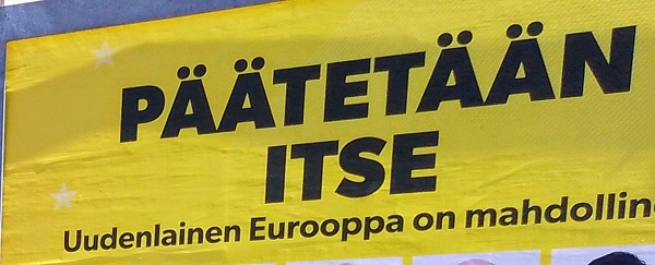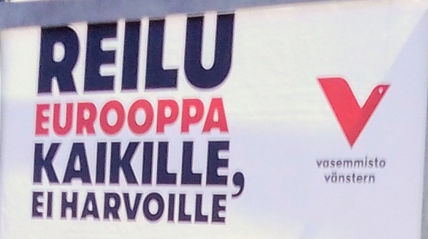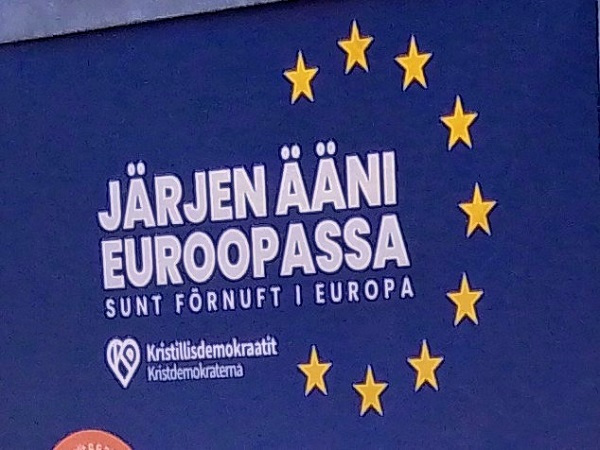 Kirkkonummen punaisella torilla Eurovaalien sloganit ja naakkakin tänään.
