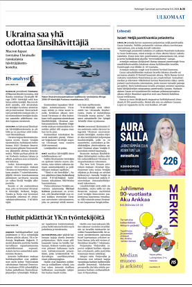 SANOMANETTI - N:o 2929 - Sunnuntai 30.06.2024 - Extra! Puheentunnistuksen tekstiä Pajusen ja Heikkisen ohjelmasta 28.6.2024. Sarjassa Epätäydellinen maailma. - Arvopohjainen realismi - Stubb muutti puhettaan Ukrainan voitosta - näin hän selittää MTV:llä (IL) - Lähteet: Ukraina tukeen merkittävä käänne Usa:ssa. (IL) - Ukraina ja EU solmivat turvallisuussopimuksen. (IL) - Joukko venäläisiä haluaa väkivaltaisen lopun Putinille. (IL) - Miksi venäläissotilaat tappavat itsensä ja kaverinsa ? (IL) - Mikä ero on DCA:lla ja Natolla? Uutissuomalainen kävi läpi, millaisesta sopimuksesta eduskunta pian päättää. (Keskisuomalainen) - Rölli ja metsän henki. (2002). "Elokuva saa katsojan pohtimaan hyvän ja pahan olemusta - iästä riippumatta." (Keskisuomalainen. Marko Ahonen.) - Stubb armahti huumerikollisen. Näin hän oli puhunut armahdusoikeuden käytöstä ennen presidentinvaaleja. (HS) - Ukrainan sota. Suomi toimittaa Ukrainaan uuden 159 miljoonan euron tukipaketin. (HS, kuvassa Häkkänen) - Tuomiot. Päätekijöille pitkät tuomiot. Oikeuspiti Dödspartrulleniin kytkeytynyttä Suomen ... (HS, kuvassa paketteja). - Arvopohjainen realismi - Koonnut Pertti Manninen. --- Lauantai 29.06.2024 - Kuvat - Heurekan astronautit: Akseli, Frans ja Lasse. Tiedekeskus Heurekan reissulta tiistaina 25.6.2024. Kuvat lähetti Lasse M. --- Sunnuntai 23-06-2024 - Arvopohjainen realismi (Stubb) - JUHANNUKSEN JÄTTILEHTI Tv-ohjelmat, lisäristikot, juhannusvisa... ILTALEHTI alma Petteri Orpon erikoishaastattelu JUHANNUS PERHEEN KANSSA KESÄRANNASSA Ex-pääministerin tavanneet ulkomaalaiset kertovat TÄLLAINEN SANNA MARIN ON KULISSIEN TAKANA "Yksi heikkous" IL:n suuri kysely TÄLLAISTA ON SUOMALAISTEN SEKSIELÄMÄ Ukrainassa taistellaan suomalaisten opeilla "PELASTANUT MONTA HENKEÄ" Juha Miedon, 74, OHJEET STRESSIN POISTOON Helmi Loukasmäki, avoimena JATKUVA VERTAILU ARMIIN TURHAUTTAA TESTASIMME MAKULONKEROT JA UUDET GRILLIMAKKARAT Mervi Kallio, 47, PALJASTAA HUIMAN KUNTONSA SALAISUUDEN SUOMEN SUURIN UUTISMEDIA ILTA-SANOMAT PERUSTETTU 1932 160 sivua! JUHANNUSJÄTTI MÖKKIEN MAHTAVAT MUODONMUUTOKSET JULKKISTEN IHANAT HÄÄKUVAT Vihkiminen vuoren huipulla: poliisit juhliin, kimppu unohtui ... Yhdessä 35 vuotta TEEMU AVAUTUU RAKKAUDESTA SIRPAAN Kirsi Alm-Siira Juhannuksen- vietto mullistui Suuret tietovisat: 150 kysymystä Tonnin ristikko Rakkaushoroskooppi Li Andersson Brysseliin TYTÄR VAIKUTTI ISOON PÄÄTÖKSEEN Tällaista on elämä 60000 €/kk -eläkkeellä OSTA MYÖS ... Arvopohjainen realismi (Stubb) --- Lauantai 22.06.2024 - Juhannus - Arkisto. Kuva vuodelta 1960 (n.). - Kivisaaren juhannuskokko "65 vuotta sitten". Kivisaari. Helsinki. Vuonna 1960 (n.). Ullakolta löytyneestä paperikuvasta keskiviikkona 2008-06-18. Sinistys ja kontrasti perjantaina 2011-06-24. Pertti Manninen. Isonnettuna 2014-06-21. --- Perjantai 21.06.2024. - Kuvia aatonaattona 20.6.2024. 09:15 Hyvää Jussia! RMV-korut. Munkinmäentie. Kirkkonummi. Uusimaa. 12:36 Hyvää lomaa! Uimahalli. Gesterbyntie. Kirkkonummi. Uusimaa. 14:04 Hyviä lukuhetkiä! City Market. Kirkkonummi. Uusimaa. 16:02 Hyvää satoa! Oitmäki. Kirkkonummi. Uusimaa. 20:24 Käsi kädessä Poika pitelee tanskalaisen pelaajan kättä lujasti astuessaan kansallishymnin kuulemiseen. Ylen kuva. Frankfurt. Saksa. Kuvat Pertti Manninen. --- Torstai 13.06.2024. Arkisto. Kuva. 2003 tammikuu. Stanley Kubrick ohjaamassa kauhuelokuvaa Hohto vuonna 1979. Alunperin mustavalkoisen kuvan tunnelman luonut Pertti Manninen. - Shining (Hohto) maanantaina 03.02.2003 MTV3:ssa. - Hohto ***** Stanley Kubrickin Hohto (The Shining, 1980) keräsi kovasti kehuja, mutta kirjailija Stephen King ei elokuvasta innostunut. Varmaankin siksi, että Kubrick otti suuria vapauksia alkuperäisteoksen suhteen. Tarina on hämäävän yksinkertainen. Jack Torrance (Jack Nicholson) perheineen saapuu talvivahdiksi suljettuun erämää hotelliiin, Hohto on hieno kauhuelokuva, joka toimii vielä paremmin sekoamisen ja hulluuden kuvauksena. Marko Ahonen. Päivän tv-vinkit. Keskisuomalainen torstaina 13.6.2024. --- Maanantaina 10.6.2024. Illan jännittävin minuutti. Kuvat. Petteri Orpo Annika Saarikko Riikka Purra Sofia Virta Antti Lindtman Li Andersson Li Andersson Kuvat sunnuntaina 9.6.2024 19:59:14 - 20:00:22 MTV3:n suorasta lähetyksestä. Pertti Manninen. ENNAKKOÄÄNET 00:58 - 00:38 - 00:21 - 00:17 - 00:09 - 00:01 - 00:00. - 25,3 KOK 4 --- 18,3 VAS 3 --- 15,6 SDP 2 --- 11,5 KESK 2 --- 11,2 VIHR 2 --- 6,7 PS 1 --- 5,6 RKP 1 --- 4,0 KD 0 --- 0,5 LIIK 0. - Kuvissa puolueiden puheenjohtajat H-hetkellä. --- Sunnuntai 09.06.2024. - Meidän poikamme maailmalla. Jesse Joronen ja Joel Pohjanpalo ennen peliä ja sitten juhlittuina. Joukkuekuva ennen ensimmäistä ottelua torstaina 30.5.2024 23:38 ja voiton huuman kultatuoli- ja halauskuvat maanantaina 3.6.2024 00:30. Kuvat Iltalehden lähetyksestä Pertti Manninen. - EU-vaalit. Sivuja kolmesta lehdestä vaalipäivänä. Keskisuomalinen, Helsingin Sanomat ja Iltalehti. --- Lauantai 08.06.2024 - Kuva. Tuossa! EU-vaalit 2024. Tuossa! Uusimaa. Kirkkonummi. Kirkkotori. Torstaina 6.6.2024 11:41. Pertti Manninen. - Kerrankin kunnollinen otsikko! Lue! Helsingin Sanomat tiistaina 4.6.2024. Uutiset. Viimeisestä meppipaikasta tulossa kova kisa. Eurovaalit. Teemu Muhonen HS. "HS:n mittauksessa kokoomus, SDP sekä kristillisdemokraattien ja Liike Nytin vaaliliitto saisivat lisäpaikat, Vihreät ja RKP menettäisivät yhdet paikat." - Pääkirjoitus. Kerrankin kunnollinen otsikko! Tavallisesti näissä galluppien otsikoissa unohdetaan tutkimukseen luonnostaan sisältyvät virhemarginaalit herttaisen herttaisesti. Pääkirjoitus. Pertti Manninen. Lauantai 8.6.2024 10:34. - Kaksikymmentä vuotta sitten. Torstai 10.6.2004. Etusivu ja HS-Gallupin kritiikki. --- Tiistai 04.06.2024 - nettisanomat. Extra! "Paul Wolfowitz". Kuva: Pertti Manninen. Photograph. ... - Wolfowitz 2003 - Putin 2022 - Netanjahu 2023 ... --- Sunnuntai 02.06.2024 Kuva. Tammi ponnistaa