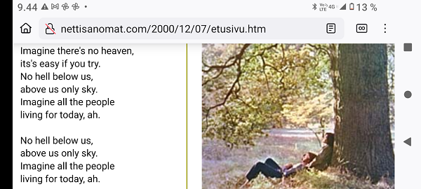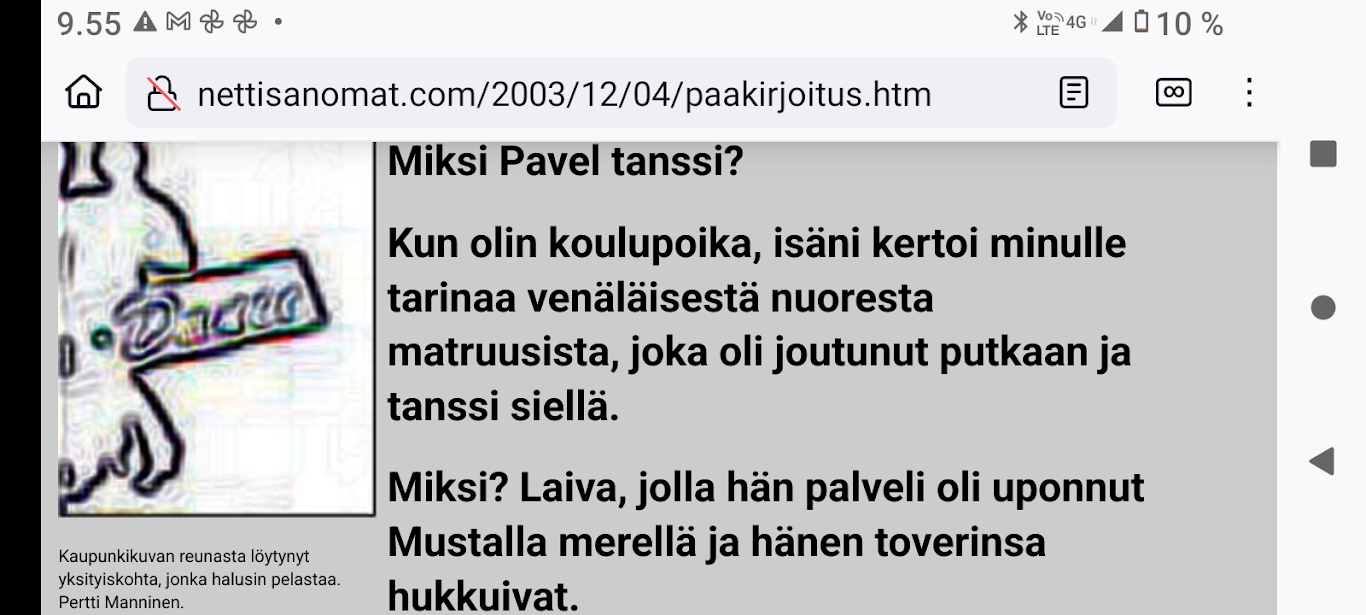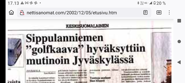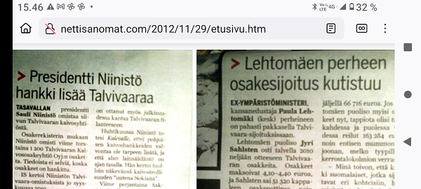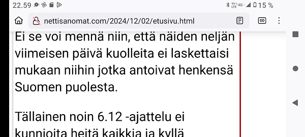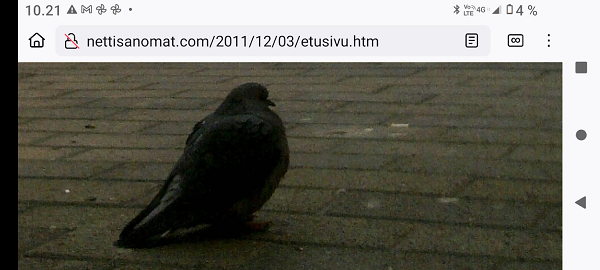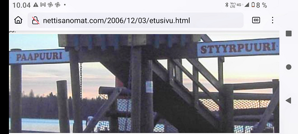 "Taivaallisen rahan aukiolle" johdattava rakennus on juuri purettu autojen paikoitusalueeksi. Lue! 20 vuotta sitten, 8. joulukuuta 1980, hyvästi. Lue! Tuuli käy heidän ylitseen. Kuva Suomalainen sosialisointi Jyväskylässä. Kaavaryöstö etenee. Raportti Itsenäisyyspäivän aattona 2002. Lue! Kaupunkikuvan reunasta löytynyt yksityiskohta, jonka halusin pelastaa. Kuva Sunnuntaina 26. joulukuuta 2004, tapaninpäivänä, kello 08.55 Suomen aikaa avasin television, joka oli jäänyt edellisenä iltana Ruotsin kanavalle. Ruudussa oli tekstiuutisia, joista kävi ilmi, että valtava hyökyaalto on iskenyt Intian valtameren rannikoille. Käänsin ohjelman BBC.News-kanavalle ja siellä oli jo kuvia ja selostusta tapahtuneesta. Kuva Alina Pogotskin - Jean Sibelius viulukilpailun voittaja 2005. Kuva "Paapuuri ja styyrpuuri illan hämärtyessä". Lauantaina 2006-12-02 lasten laivassa tukevasti maalla. Kuva Kaksoset XL-aterialla Kampin Scanburgerissa pitkän linjurimatkan jälkeen. Kuva "Suomalainen todellisuus. Materian totemi houkuttelee asiakkaita 1. adventtina". Extra! Nettisanomien sivu toukokuulta 2000: Kauppojen sunnuntaiaukiolojen lisäys. Lue! "Tämä tarjous ei toistu?". Suomi mukana jossakin aikaisemmassa EU:n huippukokouksessa edustajinaan pääministeri Matti Vanhanen (vasemmalla takana) ja tasavalla presidentti Tarja Halonen (oikealla edessä). Kuva Yletv2:n uutislähetyksesstä, jossa kerrottiin edustusasiasta ristiriitaisia näkemyksiä. Kuva Päivän puheenaiheet Ilta-Sanomat Kari Tapio kuoli yllättäen. Iltalehti Rakastettu Kari Tapio on poissa Tänään Kuva "Kyyhky ja tähti". Keski-Suomi. Jyväskylä. Kauppakatu. Keskiviikko 2011-11-30 klo 11.42. Kuva "Presidentiksi tultuaan Niinistö on ottanut myös julkisuudessa kantaa Talvivaaran tilanteeseen. Huhtikuussa Niinistö totesi Kalevalle, ettei pohjoisen kaivoshankkeiden valvontaa ole tarpeen lisätä, ja että alan lainsäädäntö on ajantasalla. Hän kertoi tuolloin näkevänsä kaivosteollisuuden "uutena Nokiana". Lue! Sattumalta lähdin matkaan ja sattumalta sain Ilta-Sanomat luettavakseni lauantaina 2013-11-30. Yhdessä kuvassa hän on sellaisena kuin hänet muistan. Olimme porukan kanssa Tampereella ja Pyynikin portaita laskeuduimme. Ja nyt sattumalta muistan, taas. Lue! "Viimeinen kuva" eli selfie ellei peräti selfish! PS. Viimeinen kuva tarkoittaa tämän pokkari Ricoh PX:n simahtamista suolaisessa merivedessä, vaikka kamera myyntihetkellä olikin "waterproof". Kuva Peuroja takapihalla. Kirkkonummi. Lapinkylä. Kuvat PÄÄKIRJOITUS. PÄÄMINISTERI JUHA SIPILÄ EI OIKEASTI HALUA KARISTAA JÄÄVIYSEPÄILYJÄ HARTEILTAAN. Niin kauan kuin pääministeri Juha Sipilä haluaa salata omistuksensa VAKUUTUSKUORIIN, niin ei ole mahdollisuutta selvittää onko hän jäävi osallistuessaan päätöksiin valtion rahojen myöntämisessä erilaisille yrityksille. Tämä Terrafame-case oli joko vahinko tai sitten koepallo tuleville suunnitelmille ja toiminnoille. Lue! Kysely: ”Herra tasavallan presidentti, kuinka te kehtaatte nostaa Euroopan investointipankista 3000 euron kuukausieläkettä?”(Sauli Niinistölle). Lue! Hallituksen puheenjohtaja Antti Aarnio-Wihuri on saanut vankilatuomion törkeästä veropetoksesta 1990-luvulla, josta tietoja on vaikea löytää. Google-haulla löytyi kyllä tietoa asiasta, kun osasi etsiä myös "veropetoksella". Lue! Kelmeistä katalin! Rinne ei suostunut taipumaan. Ilta-Sanomat tiistaina 03.12.2019 14:20. Lehtitelineessä suoraan ovesta sisääntullessa. Kirkkonummi. Lidl. Kuva Suomi24. Keskustelusta. LAINAUS HS: Ohisalon kohdistuva uhka ei pidä paikkaansa. Anonyymi 11.12.2020 23:14 ... Kukakohan mahtoi syöttää medialle väärää tietoa asiasta? LAINAUS LOPPUU Lue! Kaksi viikkoa myöhemmin ... Hallitus nyt maskissa eduskunnan kyselytunnilla torstaina 2.12.2021. Kuvat Illan hämärtyessä peura on löytänyt lintujen ruokintapaikan ja käyttää hyväkseen tarjoilua. Lue! Pääkirjoitus. Viimeinen itsenäisyyspäivä ilman ydinaseita? Lue! Päivän kookkain, lintu. Fasaani. Uusimaa. Kirkkonummi. Björkdal. Kuva Itsenäisyyspäivän juhlat 2024 n. 6.12. Kyllä itsenäisyyspäivää pitää juhlia ja kunnioittaa itsenäisyyspäivänä 6.12 eikä noin 6.12. Presidentti Stubb on nyt tehnyt päätöksen, että elossa oleville veteraaneille ja lotille järjestetään juhlat 4 päivää aikaisemmin 2.12.2024. Lue!