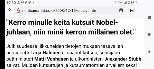 SANOMANETTI - N.o 2981 - Lauantaina 21.12.2024. - Kuvat. Punatulkku vielä marjoja pihlajastakin löytää Vilskettä ruokintapaikalla. Lauantai 21.12.2024 10;22 ja 10:27. Uusimaa. Kirkkonummi. Björkdal. Kuvat Pertti Manninen. --- SANOMANETTI - N.o 2980 - Perjantaina 20.12.2024.- Kuvat . Isäntä ja isännän varjo. "Rasmus on nousssut pöydälle auringon lämpöön, kun oikea isäntä yrittää hörppiä päiväkahviaan." Perjantai 20.12.2024 12:27. Uusimaa. Kirkkonummi. Björkdal. Kuvat Pertti Manninen. . - "Hullutus". Tähtien sota ei ole leikkiä, sota ei koskaan ole leikkiä, se on hullutus ... 14.12.1985. PUHEENVUORO KIRKKONUMMEN TALOUSARVIOKOKOUKSESSA LAUANTAINA JOULUKUUN 14. PÄIVÄNÄ 1985. Pertti Manninen. .--- SANOMANETTI - N.o 2979 - Tiistaina 17.12.2024. - "Uimahalli". 14.12.1985. Pertti Manninen. SKDL:n VALTUUSTORYHMÄN PUHEENVUORO KIRKKONUMMEN TALOUSARVIOKOKOUKSESSA LAUANTAINA JOULUKUUN 14. PÄIVÄNÄ 1985. - Jälkisanat 22 vuotta myöhemmin. Vappuna, Suomalaisen työn päivänä 2008-05-01. Pertti Manninen. - Kirkkaan päivän kuvia 10.12.2024 13:43 Uimahallin kahvilassa. - Kirkkonummen uimahalli on Kirkkonummella sijaitseva uimahalli, joka vihittiin käyttöön vuonna 2001. Wikipedia. --- SANOMANETTI - N.o 2978 - Maanantaina 16.12.2024. - Arkisto - 25 vuotta sitten 16.12.1999. Milloin tehdään viimeinen painokone? "Kokonaan ilman painettua tekstiä selviytyvä sukupolvi on jo lähellä ellei jo kasvamassa." Lue! - Milloin ihminen vapautuu rattaiden syövereistä? "Tällä menolla on siis vastattava: ei koskaan, mikä on kyllä hirveää." Lue! - Bergerac oikaisee: Hannes Kulvik operoi Jerseyn saarilla, ei Cayman-saarilla. Kuva: "Rahatukku vaihtaa omistajaa". Lue ainutlaatuinen kirje! Lue! - Lasten päivä 4.10.1999 Kuva - Tare on poissa. Kuva. -25 vuotta sitten 16.12.1999. --- SANOMANETTI - N.o 2977 - Sunnuntaina 15.12.2024. - Kuva. Tammen tikkaaja tuli taas 15.12.24. Pari päivää pikkutikka on taas käynyt tammea nakuttelemassa. Uusimaa. Kirkkonummi. Björkdal. Sunnuntai 15.12.2024 11:45. Pertti Manninen. - Murhia alkuillan aluksi ja iloksi! Tänään 17:30 Yle TV1 Murhia ja kantrimusiikkia ... MTV3 Murha Helsingörissä ... Kuva lauantaina 14.12.2024 17:46. Pertti Manninen.- Arkisto 2001. Ei mitään uutta auringon alla. 19.4.2001, siis jo 23 vuotta sitten: Kuolema keinutuolissa. Tappaako Raid? Näemmekö liikaa murhia, tappoja ja väkivaltaa kodeissamme? Tappamista iltojemme iloksi ja viihteeksi kaikilta kanavilta. Tavallinen television katsoja on voimaton kaikilta kanavilta tulevan tappamisen tulvassa. Nyt kun kuolemanrangaistuksen kannatus Suomessa on juuri julkaistun gallupin mukaan hämmästyttävän korkea, pitää kysyä, onko tällä tappamistulvalla vaikutusta jo aikuisiinkin katsojiin? Tulevaisuuden ja lapsiemme tähden kanavien pitäisi pohtia olemassaolonsa tarkoitusta. Pääkirjoitus. Pertti Manninen. 19.04.01. --- SANOMANETTI - N.o 2976 - Torstaina 12.12.2024. - Kaunialan sairaalassa vietettiin tänään viimeistä joulujuhlaa. MTV Uutiset torstaina 12.12.2024. Joulujuhlaperinne jo lähes 50 vuotta Kaunialan sairaalassa vietettiin tänään tunteikkaat viimeiset joulujuhlat. Sairaalan toiminta lakkaa alkuvuodesta kun hyvinvointialueet eivät enää tilaa sen sairaala ja kuntoutuspalveluita. Juhlia ehdittiin järjestää useina vuosikymmeninä. Porilaisten marssi soi Anu Korhonen: 1946 perustetun Kaunialan sairaalan joulujuhlaperinne on kestänyt jo lähes 50 vuotta. Tunnelma juhlassa oli jälleen käsin kosketeltava. Lucia-kulkue Yrjö Laurila: Herkkä ja lämminkin, sydämellinen omalla tavallaan ja Isänmaallinen ennen kaikkea, tuo mieleen kyllä elettyä 99 vuotta. Anu Korhonen: Haikean sävyn juhliin tuo se että joulujuhlat järjestettiin tänään viimeistä kertaa. Kaunialan sairaalan toiminta lakkaa kun hyvinvointialueet eivät enää tilaa sen sairaala- ja kuntoutuspalveluja. Kaunialassa on nyt 70 asukasta. Toiminta tulee jatkumaan ympärivuorokautisen ryhmän hoivakodissa, jossa on 24 asiakaspaikkaa. Välähdyksiä kuntotustoiminnasta Minna Lindfors, virikeohjaaja Kaunialan sairaala: Mulla on surku siitä että sotainvalidit, sotaveteraanit ja lotat joutuvat vaihtamaan kotia. Osa on sanonut että mieluummin he vaihtaisi sinne taivaan kotiin. Kutsuvieraat ruokapöydässä. Anu Korhonen: Tasavallan presidentti Alexander Stubb kiitti maamme kunniakansalaisia juhlapuheessaan. Alexander Stubb: Me suomalaiset olemme sitkeä, sisukas ja sivistynyt kansa. Te tiedätte tämä omakohtaisesti, nyt on meidän nuorempien polvien tehtävä huolehtia Suomen turvallisuudesta. Teemme tätä työtä joka päivä mielessämme teidän uhrauksenne. Lapset laulavat Santa Luciaa. Videon tekstin purkanut Pertti Manninen oikeenkuulemisvarauksin. - Presidentti Alexander Stubb ja puolustusministeri Antti Häkkänen veteraanien seurana kahvipöydän antimia nauttimassa. Kuva MTV Uutisten sivulta perjantaina 13.12.2024 09:28. - --- --- --- Lauantai 20.07.2024 - MUISTA LIIVIT! - Kesän hyvä teko: Opeta lapsi uimaan! --- Maanantai 15.07.2024 - Maailman menoa n. heinäkuun 15. 1999 - 2024 ---- Sunnuntai 14.07.2024 - Salamurhayritys. - --- Sunnuntai 07-07-2024 - Eino Leino 146-vuotta. - Eino Leinon palkinto runoilija Sirpa Kyyröselle. --- Sunnuntai 30.06.2024 -Pääkirjoitus. 2001 - 20 VUOTTA SITTEN: LASKU. ASIANAJOTOIMISTO PEKKA MONONEN KY Vantaa 31.5.2001. --- Torstai 09.05.2024. Helatorstai. - Kuva Kissa ahdingossa. --- SMILE from MODERN TIMES - "Förbjud atomvapnen". 1957 KUVA --- etusivu - Lauantai 21.12.2024 - Kuvasanomat - Sanomatori - Viikkosanomat - Härkää sarvista - 12.fi - N:o 2981. - Sivu 2024-12-21 , nettiin 2024-12-21 20:31, linkkejä 2024-12.21. "Haukkaavan logon" teki Jaikon kurssilla 1999 Mika. Ensimmäisen kerran logo oli lehdessä tortaina 30.9.1999. Pari vuoden jälkeen se korvautui steriilillä kirjainlogolla. Nyt se on taas mukana!