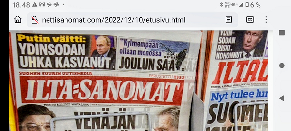 Maanantaina 25.11.24. Pommia odotellessa 2 ... http://www.nettisanomat.com/2023/11/17/etusivu.html#ti20231114puhtunnato Sauli Niinistö: Minulla on hyvä suhde Putiniin" Iltalehti. - Nettisanomat. Pääkirjoitus. (21.11.2017) http://www.nettisanomat.com/2017/11/21/etusivu.html#sunnuntai20171119kuva 31.10.2024 Niinistö: Näin Putin pysäytetään. ILTA-SANOMAT. - Uusi varoitus Venäjästä. Niinistöltä tärkeä viesti jokaiselle suomalaiselle. ILTALEHTI. 4.11.2024 18.11.2024 19.11.2024 Putin huväksyi uuden ydinasedoktriinin: Tällainen se on. ILTALEHTI. 19.11.2024