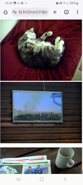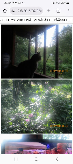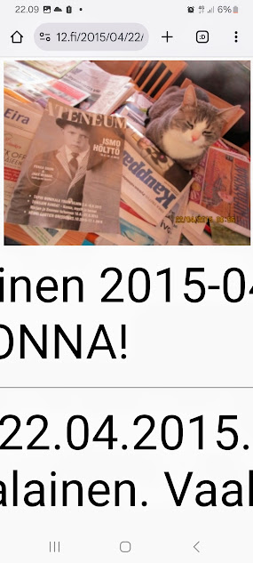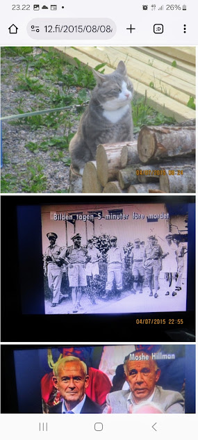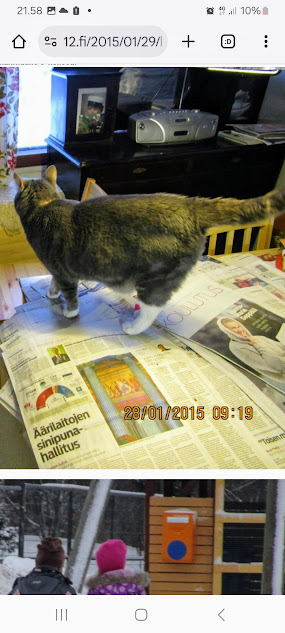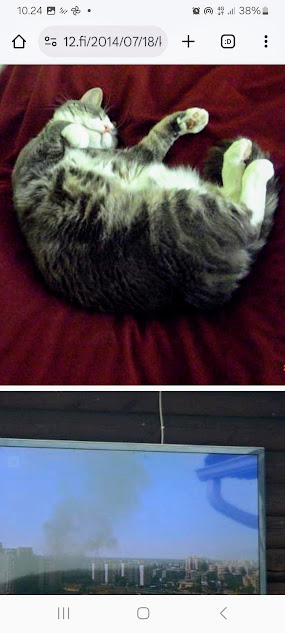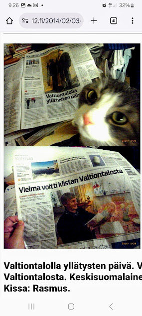Sanomanetti nro 3100 - Torstai 26.6.2025. - Arkisto. - Rasmuksen matkassa 17 vuotta. Kiitos. Lue! - 2008 - 2009. Täällä - 2010 - 2011. Täällä - 2012 - 2013. - Täällä --- Arkisto. 3.2.2014. Valtiontalolla yllätysten päivä. Vielma voitti kiistan Valtiontalosta. Keskisuomalainen perjantaina 24.01.2014. Kissa: Rasmus. Kuvat: Pertti Manninen. Isonna! - 9.4.2014. "Suomi joutuu muuttamaan tietolainsäädäntöään". Keskiviikkona 09:29 - 15:57 HS tietolainsäädännöstä - Keslisuomalainen Nokian karmeasta virheestä - Agricolan muistamista Laukaan kunnantalolla - Pinkki mopo kaartaa saksalaisen kaupan pihaan (LIDL). Kuvat: Pertti Manninen. Keski-Suomi. Jyväskylä ja Laukaa. Isonna! - 18.4.2014. "... kun Rasmuskin siinä oleili hollilla." Keskisuomalaisen ja muidenkin lehtien tv-kriitikko Marko Ahonen kirjoitti Pitkäperjantain tv-ohjelmista otsikolla "Surujuhla ilman surua". Hän vei kynän kädestäni. Kun aamulla tutkailin ohjelmistoa niin Helsingin Sanomista kuin Keskisuomalaisestakin, niin en mitään löytänyt. Ajattelin mielessäni, miksi ei voitaisi esittää joka pääsiäinen Pasolinin "Matteuksen evankeliumia", jonka olen nähnyt vuosikymmenten aikana ainakin kymmenen kertaa. Kanavia Ylelläkin on ihan riittävästi saada se johonkin rakoseen sovitettua, mielestäni. Päätin sitten yrittää etsiä sen jostakin kätköstä, DVD:n olen hankkinut joku vuosi sitten jostain alennusmyynnistä. Ohjelmakarttaa aikani tutkisteltuani, pääsin sitten sivun eteenpäin ja hämmästykseni oli suuri: toimittaja Marko Ahonen kirjoitti samasta aiheesta ja eihän siinä sitten kannattanut kuin kiireesti kuvata sivu, kun Rasmuskin siinä oleili hollilla. Myöhemmin hain paremman kameran ja tallensin artikkelin. Kuvat perjantaina 2014-04-18 klo 07:05 ja 07:15. - 24.7.2014. "Väsähtänyt kissa nauttii olostaan isännän uudella vuoteella." Kuvaviikko keskiviikosta 09.07.2014 alkaen. Perjantai 11.07. Väsähtänyt kissa nauttii olostaan isännän uudella vuoteella. Sunnuntai 13.07. Gaza palaa Sataman kahvilan terassin ruudussa. Suomalainen Vilja ei varmaankaan oikeasti ollut harmistunut päästeessään MM-loppuotteluun. Kuvat: Pertti Manninen. Laukaa. - 24.7.2014. "Kissa pöydällä! Rasmus raapii ikkunaa päästäkseen sisätiloihin." Kuvaviikko keskiviikosta 09.07.2014 alkaen seuraavan viikon perjantaihin 18.07.2014. Torstai 17.07. Kissa pöydällä! Rasmus raapii ikkunaa päästäkseen sisätiloihin. Torstai 17.07. Kissa pöydällä! Rasmus raapii ikkunaa päästäkseen sisätiloihin. Perjantai 18.07. Ravikuningas viettää eläkepäiviään Laukaan vihreällä niityllä. Kuvat: Pertti Manninen. Laukaa. -l 9.8.2014. "Rasmus-kissa nukahtamaisillaan juomakuppinsa viereen tv:n lähettäessä ohjelmaa Tove Janssonin elämästä tutun musiikin soidessa." Tove Jansson 100 vuotta tänään. Kuva: Rasmus-kissa nukahtamaisillaan juomakuppinsa viereen tv:n lähettäessä ohjelmaa Tove Janssonin elämästä tutun musiikin soidessa. Perjantaina 08.08.2014 klo 18:46. Kuva: Pertti Manninen. Isonna! Katso myös! Joulukuu 2013. "Unelma valkeasta joulusta" - "Ja aamulla ..." Kuvat Mitäs tämä on? - Mutta peikko kulta, miten sait nelosen käytöksestä? Kuvasarja - 29.1.2015. "Rasmus jää kotiin nukkumaan." Matkalla Suomessa keskiviikkona 28.01.2015 Keski-Suomesta Pirkanmaalle 0-kelissä. Rasmus jää kotiin nukkumaan - Koulutytöt vetävät reppupulkkiaan - Mies ja makkaramainos. Kuvat: Pertti Manninen 2015-01-28 keskiviikkona 09:10 - 12:42 matkalla Laukaasta ensin Koivurannan bussilla Jyväskylään ja sitten 9-tietä pitkin Tampereen Kalevaan. Matka jatkui sitten Tampereen Hervannan kautta Loimaalle ja Humppilaan ja takaisinkin lähtöpisteeseen, mutta se on jo sitten ihan oman tarinansa. - 22.4.2015. "LEHTIKATSAUS." HUHTIKUU 2015. LEHTIKATSAUS. VAALIT. ÄÄNEKOSKI. KUVAT Tiistai 21.04.2015. ISO NRO - METRO Kuvat: Pertti Manninen 2015-04-22 aamulla. ISONNA! -l 19.6.2015. "Rasmus-kissakin on erityisen kiinnostunut tästä otuksesta, jonka hän näkee ensimmäistä kertaa elämässään." KESÄKUU 2015. "KUN PEURA KESKEYTTI ILLAN UUTISLÄHETYKSEN ..." KUVASARJA. Ylen uutislähetyksessä torstaina 18.06.2015 valtiovarainministeri Alexander Stubb kertoo Kreikan taloustilanteesta ja ex-pääministeri Esko Aho Venäjän kaupasta yleensä ja maa-alueiden kaupasta. Kuvatekstit ovat samaan aikaan lähetetystä toisesta ohjelmasta, jossa kerrotaan uusista energiamuodoista ja niiden kehittämisestä. Tykkikuva muistuttaa Waterloon taistelun 200-vuotispäivästä ja kirjakuvat Akateemisen kirjakaupan myymisestä Bonnierille. Peura saapuu ikkunan alle ja kiinnittää kaiken huomion tässä uudessa ympäristössä. Rasmus-kissakin on erityisen kiinnostunut tästä otuksesta, jonka hän näkee ensimmäistä kertaa elämässään. Uutislähetys jatkuu Juhannuksen liikenteestä kertovalla jutulla. Kuvat: Pertti Manninen. Uusimaa. Kirkkonummi. Kauhala klo 20:35 - 20:52. ISONNA! https://www.nettisanomat.com/2015/06/19/etusivu.html 20.6.2015. "JUHANNUSAATTONA ENNEN ILTAA." KESÄKUU 2015. JUHANNUSAATTONA ENNEN ILTAA. 39 KUVAA. Kuvat: Pertti Manninen. Ilta-Sanomat ja Iltalehti torstai 18.06.2015. Uusimaa. Kirkkonummi. Lapinkylä ja ympäristö perjantai 19.06.2015 klo 05:06 - 14:08. ISONNA! - 7.22.2015. "KISSAN NIMI ON RASMUS, JOKA NUKAHTAA PAPEREIDEN PÄÄLLE JA KATSELEE KUUTA." HEINÄKUU 2015. PRESIDENTTI SAULI NIINISTÖN SELITYS, MIKSEIVÄT VENÄLÄISET PÄÄSSEET ETYK-JUHLAKOKOUKSEEN JA MUITAKIN KUVIA. 24 KUVAA. KISSAN NIMI ON RASMUS, JOKA NUKAHTAA PAPEREIDEN PÄÄLLE JA KATSELEE KUUTA. Kuvat: Pertti Manninen Ylen uutislähetyksestä teksteineen. Uusimaa. Kirkkonummi. Lapinkylä keskiviikko 01.07.2015 ja torstai 02.07.2015. ISONNA! - 8.8.2015. Rasmus väsähtää telakkauutisiin. Kuva. Pertti Manninen tiistaina 2013-01-15 09:13. HS: Telakalle haetaan pikaratkaisua- Keskisuomalainen: Telakkateollisuuden pelastajaa ei tunnu löytyvän. HEINÄKUU 2015. JUHLAA. TYÖTÄ JA HISTORIAAKIN ERÄÄNÄ HELLEPÄIVÄNÄ 04.0