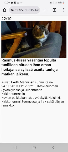 24.11.2019. Sunnuntai 24.11.2019. Marraskuu. Ajan kuvia. 22:10 Rasmus-kissa väsähtää lopulta tuolilleen oltuaan ihan oman hoitajansa sylissä useita tunteja matkan jälkeen. Kuvat: Pertti Manninen sunnuntaina 24.11.2019 11:12- 22:10 Keski-Suomen Jyväskylässä ja Uudenmaan Kirkkonummella. Kuvien paikkakunnat: Jyväskylä; Helsinki, Kirkkonummi Suomessa ja Irak sekä Libyan rannikko. https://www.nettisanomat.com/2019/11/24/etusivu.html