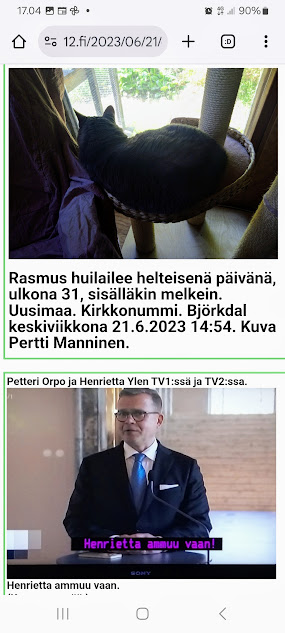 | 21.6.2023. "Rasmus huilailee helteisenä päivänä, ulkona 31, sisälläkin melkein." ![]() ![]() ![]() Rasmus huilailee helteisenä päivänä, ulkona 31, sisälläkin melkein. Uusimaa. Kirkkonummi. Björkdal keskiviikkona 21.6.2023 14:54. Kuva Pertti Manninen. Petteri Orpo ja Henrietta Ylen TV1:ssä ja TV2:ssa. Henrietta ammuu vaan. (Kangas repeää.) Muu? Ööm? Mitä? Voi ei ! Housuni repesi. Mitä minä nyt? Mutta... miten? Hihihi ! KUVASARJA Tiistai 20.6.2023 17:01-17:01. Pertti Manninen. https://www.nettisanomat.com/2020/07/22/etusivu.html |