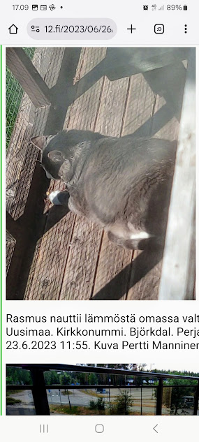| 26.6.2023. "Rasmus nauttii lämmöstä omassa valtakunnassaan." ![]() ![]() ![]() ![]() Rasmus nauttii lämmöstä omassa valtakunnassaan. Uusimaa. Kirkkonummi. Björkdal. Perjantai, aatto 23.6.2023 11:55. Kuva Pertti Manninen. Juhannusaattona kahvia, vettä ja leipää Dawin terassilla. Uusimaa. Kirkkonummi. Veikkola. Perjantai 23.6.2023 16:26. Kuva Pertti Manninen. https://www.nettisanomat.com/2023/06/26/etusivu.html