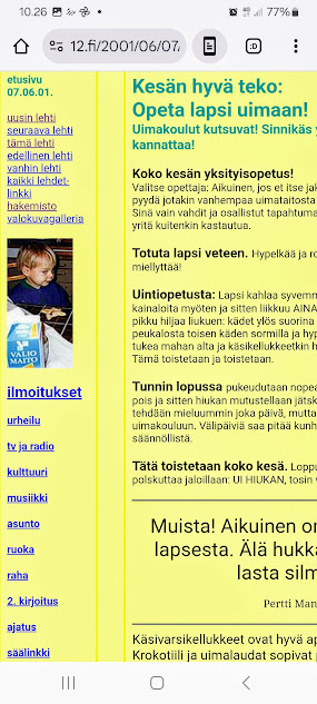 Sanomanetti nro 3108 - Lauantai 5.7.2025 - Arkisto. nettisanomat.com 24 vuotta sitten kesäkuussa 2001. Kesän hyvä teko: Opeta lapsi uimaan! Uimakoulut kutsuvat! Sinnikäs yksityisopetuskin kannattaa! Koko kesän yksityisopetus! Valitse opettaja: Aikuinen, jos et itse jaksa tai sinulle tulee jatkuvasti vilu, pyydä jotakin vanhempaa uimataitosta lasta ryhtymään uimaopettajaksi: Sinä vain vahdit ja osallistut tapahtumaan vaikka verkkarit päällä: Välillä yritä kuitenkin kastautua. Totuta lapsi veteen. Hypelkää ja roiskikaa varovasti, jutun täytyy miellyttää! Uintiopetusta: Lapsi kahlaa syvemmälle aluksi napaa ja myöhemmin kainaloita myöten ja sitten liikkuu AINA rantaanpäin: Aluksi kävellen ja pikku hiljaa liukuen: kädet ylös suorina pään yläpuolelle, tiukka ote peukalosta toisen käden sormilla ja hypähdys rantaan päin. Opettaja voi tukea mahan alta ja käsikellukkeetkin helpottavat pinnalla pysymistä. Tämä toistetaan ja toistetaan. Tunnin lopussa pukeudutaan nopeasti lämpöisesti, märkä uima-asu pois ja sitten hiukan mutustellaan jätskiä ja limsaa tai mehua. Näin tehdään mieluummin joka päivä, mutta pakolla ei kannata lähteä uimakouluun. Välipäiviä saa pitää kunhan touhu on kuitenkin säännöllistä. Tätä toistetaan koko kesä. Loppukesällä lapsi jo hiukan liukuu ja polskuttaa jaloillaan: UI HIUKAN, tosin vain hiukan. Muista! Aikuinen on aina vastuussa lapsesta. Älä hukkaa hetkeksikään lasta silmistäsi. Pertti Manninen Käsivarsikellukkeet ovat hyvä apu uimaopetuksessa. Krokotiili ja uimalaudat sopivat potkuharjoitteluun. Uimarengas on parasta antaa jo uimataitoisen lapsen leikkeihin, koska se voi kipata, lähteä tuulessa karkuun, eikä siin uima-asento ole oikea. Tämä juttu julkaistu vuosi sitten nettisanomat.com:issa 08.06.00. - Arkisto. 23 vuotta sitten kesäkuussa 2002. Minne hävisivät Soneran rahat? Minne hävisivät Soneran valvojat? Netissä julkaistun Sonera-kirjan valtio-omistajan valvonnan laiminlyöntiä koskevat luvut. Pääosissa viestintäministeri Olli-Pekka Heinonen ja valtiovarainministeri Sauli Niinistö sekä maan hallituksen ydinosa sekä tietenkin vastuussa olevat virkamiehet. MINNE HÄVISIVÄT SONERAN RAHAT ? Esipuhe Tässä kirjassa kuvataan Soneran tapahtumia vuosien 2000 ja 2001 aikana Kaj-Erik Relanderin johtajakaudella. Näistä tapahtumista on kerrottu osittaisia ja epätäydellisiä tulkintoja mediassa. Tässä kirjassa valotetaan ensimmäistä kertaa tapahtumien todellista kulkua. Näin pyritään kertomaan sijoittajille, veronmaksajille, Soneran henkilöstölle ja kaikille Soneran asioista kiinnostuneille Soneran asioiden todellinen tila vuosina 2000-2001. Se kiinnostanee monia ihmisiä. ... - nettisanomat.com 26 vuotta sitten heinäkuussa 1999. - nettisanomat.com 25 vuotta sitten kesäkuussa 2000. . -------- Sanomanetti nro 3107 - Perjantai 4.7.2025 - Arkisto. nettisanomat.com 26 vuotta sitten heinäkuussa 1999. Jaska Jokunen keväällä 1999 Jyväskylässä Reipas puhe, hillitty huuto, rajaton riemu, iskevä musiikki ja kirkas laulu. Ressukin lukee, tietenkin! Ressukin laulaa, tietenkin! Ongelma 1. Ongelma 2. Ystävyyden ylistys yhdessä ja erikseen. Koppi, pallo on vangittu, vaikeudet voitettu. Ilo tulee sydämestä, kaikilla! Keitä he olivat? Nuoria teatterintekijöitä: näyttelijät, muusikot, lavastajat, puvuntekijät, ohjaajaa unohtamatta ylittivät itsensä. Valaistus, koreografia ja kaikki muu oli paikallaan. Kiitos esityksestä, josta kaikkein nuorimmat ja kaikkein vanhemmat ja väli-ikäiset saivat omat muistonsa, 8-vuotias Erika muiden mukana. Kun löydän käsiohjelman kerron teidän nimenne. 6.8.1999 Pertti Manninen. - Arkisto. nettisanomat.com 25 vuotta sitten kesäkuussa 2000. LO M A L L A torstaina 15. kesäkuuta 2000 - torstaina 22. kesäkuuta 2000 - torstaina 29. kesäkuuta 2000 - torstaina 6. heinäkuuta 2000 - torstaina 13. heinäkuuta 2000 - torstaina 20. heinäkuuta 2000 - torstaina 27. kesäkuuta 2000 Kesän hyvä teko: Opeta lapsi uimaan! Uimakoulut kutsuvat! Sinnikäs yksityisopetuskin kannattaa! ------ Sanomanetti nro 3106 - Torstai 3.7.2025 -Kuva. Mettä keräämässä, uutterasti. Uusimaa. Siuntio. Päivärinne. Keskiviikko 3.7.2025 13:22. Kuva Pertti Manninen. - Linkki. Rasmuksen matkassa 17 vuotta. Kiitos. - Vuodet 2008 - 2025. --------- Sanomanetti nro 3105 - Keskiviikko 2.7.2025 - Kuva. Kukka kukkii. Uusimaa. Kirkkonummi. Björkdal. Tiistai 1.7.2025 08:24. Kuva Pertti Manninen. - Linkki- Rasmuksen matkassa 17 vuotta. Kiitos. - Vuodet 2024 - 2025. -------------- .Sanomanetti nro 3104 - Tiistai 1.7.2025 - Kuva. Pensas kukkii. Uusimaa. Kirkkonummi. Björkdal. Tiistai 1.7.2025 08:23. Kuva Pertti Manninen. - Linkki- Rasmuksen matkassa 17 vuotta. Kiitos. - Linkki. Vuodet 2022 - 2023.-------- Sanomanetti nro 3103 - . --------- Sanomanetti nro 3102 - - - -- - - - - ---- SMILE from MODERN TIMES - --- etusivu - Lauanntai 5.7.2025. - Kuvasanomat - Sanomatori - Viikkosanomat - Härkää sarvista - 12.fi - N:o 3108 - 2025-07-05 , nettiin 2025-07-05 17:44, linkkejä 2025-07-05.