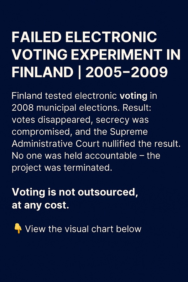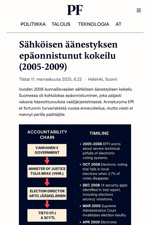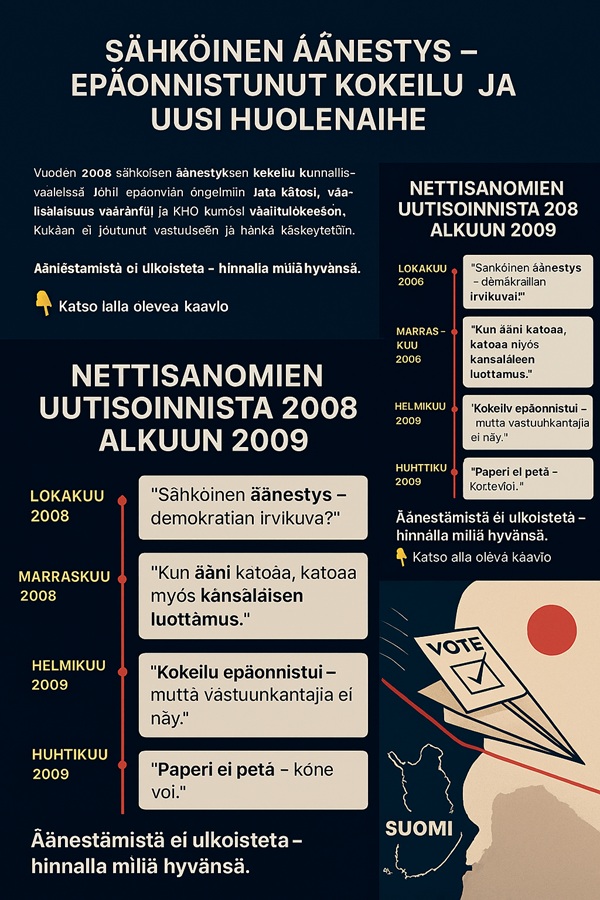 Tässä ovat pyytämäsi kaksi versiota: journalistinen artikkeli ja pääkirjoitus. Molemmat käsittelevät sähköisen äänestyksen epäonnistunutta kokeilua Suomessa ja ajankohtaista huolta ääntenlaskennan ulkoistamisesta. 📰 Artikkeli: Sähköinen äänestys – epäonnistunut kokeilu ja uusi huolenaiheJulkaisupäivä: 11.11.2025 klo 6:22 Toimitus: Nettisanomat Vuoden 2008 kunnallisvaaleissa Suomessa toteutettiin sähköisen äänestyksen pilottikokeilu kolmessa kunnassa: Kauniaisissa, Karkkilassa ja Vihdissä. Kokeilu epäonnistui, kun äänestysjärjestelmässä ilmeni vakavia käytettävyysongelmia ja ääniä katosi. Korkein hallinto-oikeus kumosi vaalituloksen, mutta vaalisalaisuuden mahdollinen rikkoutuminen ei johtanut rikosoikeudelliseen tutkintaan. Vastuuketju