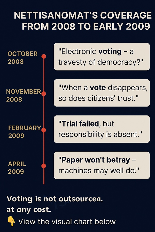 📚 Arkistokooste: Nettisanomat ja sähköinen äänestys (2005–2009)Nettisanomat seurasi sähköisen äänestyksen kokeilua kriittisesti ja julkaisi useita artikkeleita, joissa nostettiin esiin demokratian vaarantuminen, vaalisalaisuuden epävarmuus ja poliittisen vastuun puute. Tässä kooste heidän keskeisistä kirjoituksistaan: 🔹 2005–2006