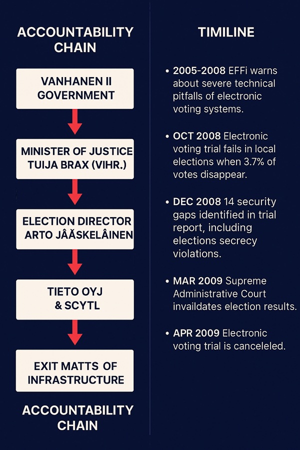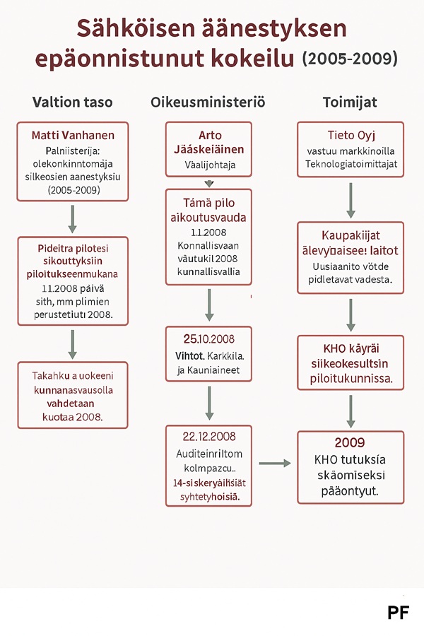 Tässä on ehdotus sosiaalisen median julkaisun tekstiversioksi – sopii esimerkiksi Twitteriin, Facebookiin tai LinkedIniin: 🗳️ Sähköinen äänestys – epäonnistunut kokeilu Suomessa (2005–2009) Suomi testasi sähköistä äänestystä kunnallisvaaleissa 2008. Tuloksena: äänet katosivat, vaalisalaisuus vaarantui, ja KHO kumosi vaalituloksen. Kukaan ei joutunut vastuuseen – hanke lopetettiin. 🔗 Vastuuketju: Vanhasen II hallitus → Oikeusministeri Tuija Brax → Vaalijohtaja Arto Jääskeläinen → Tieto Oyj & Scytl 📅 Aikajana: • 2005–2008: Effi varoittaa riskeistä • Lokakuu 2008: Äänet katoavat kokeilussa • Joulukuu 2008: Auditointi paljastaa 14 tietoturvapuutetta • Huhtikuu 2009: KHO kumoaa tuloksen • 2009: Hanke keskeytetään ❗️Miksi hyvin toimiva paperijärjestelmä haluttiin korvata riskialttiilla sähköisellä – muodikkuuden vuoksi? 📊 Katso visuaalinen kaavio alta 👇 Haluatko, että muotoilen tästä myös englanninkielisen version tai teen siitä karusellipostauksen rungon Instagramiin?