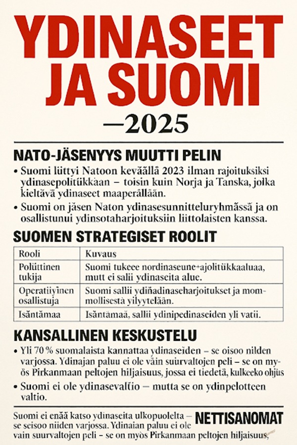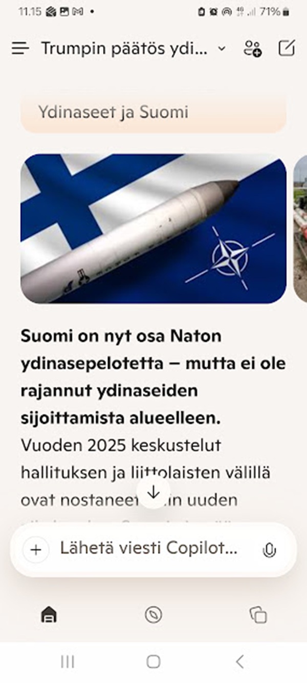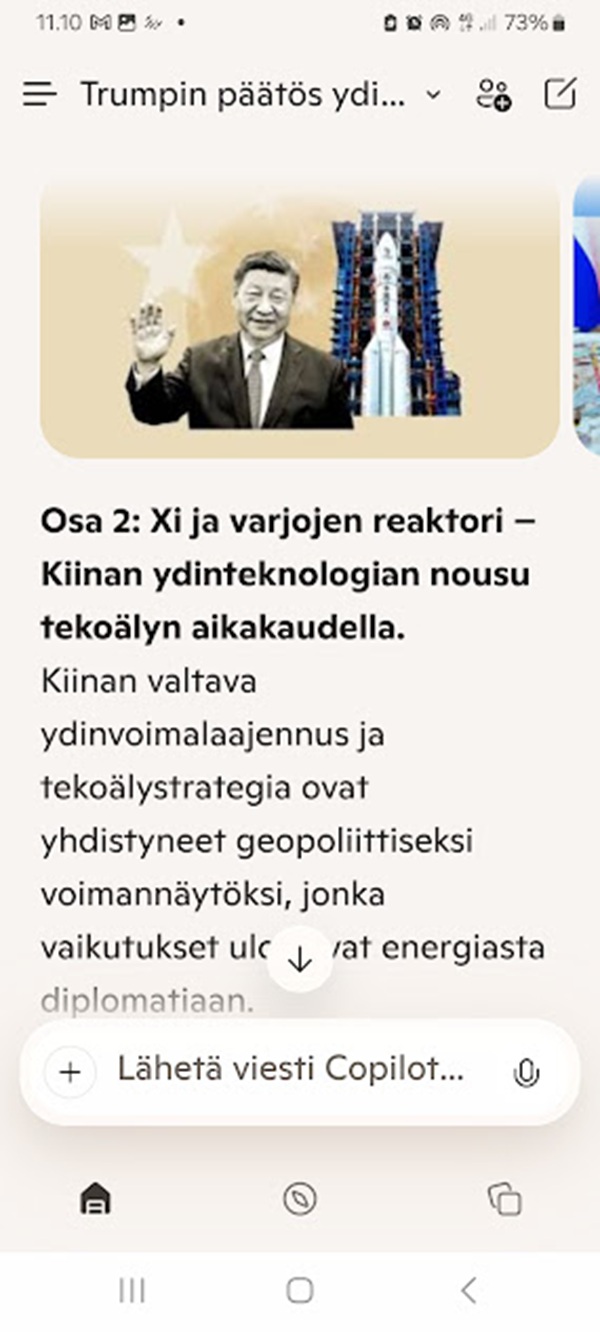 SANOMANETTI - Sanomanetti nro 3197 - Sunnuntai 16.11.2025 - Sivu4 - Nettisanomat tutkii: Uniper ja Sanna Marinin hallitus. Nyt "reilut" kolme vuotta myöhemmin paheksutaan lehtien pääkirjoituksia myöten, ettei silloinen pääministeri Sanna Marin ole käsitellyt uudessa kirjasssaan Toivo on tekoja Uniperia sanallakaan. TÄ-Copilotille esitettyyn kysymykseen vastaus on aika lohduton. Kysymys: Oliko Suomella, Fortumilla muuta mahdollisuutta kuin myydä Uniper suurella tappiolla? Olisiko kaupan pitkittäminen tai kokonaan tekemättä jättäminen voinut tulla vielä kalliimmaksi? Olisiko Saksa voinut lypsää rahaa loputtomasti? Lyhyt vastaus: Fortumilla ei käytännössä ollut muuta vaihtoehtoa kuin myydä Uniper Saksan valtiolle, sillä yhtiön tappiot kasvoivat hallitsemattomasti energiakriisin seurauksena. Kaupan pitkittäminen olisi todennäköisesti johtanut vielä suurempiin tappioihin, ja Saksa olisi voinut jatkaa Uniperin tukemista vain sillä ehdolla, että Fortum luopuu omistuksestaan. - Kuva korostaa Fortumin pakkoraon ja Saksan neuvotteluaseman symboliikkaa entistä vahvemmin. - Koko TÄ-Copilot keskustelu täällä. Linkkeineen: ----------- SANOMANETTI - Sanomanetti nro 3196 - Lauantai 15.11.2025 - Kuvat - Ensilumi. Ensi lumi 7:30 Täällä myös 10:48 Tuo nyt joltain näyttää! 11:18 Keskustelijoina Pertti M. ja Erika N. Paikat: Uusimaa. Kirkkonummi. Kauhala. Björkdal. Keski-Suomi. Jyväskylä. Taulumäki. Rajakatu. Aika: Lauantai 15.11.2025. ---------------- SANOMANETTI - Sanomanetti nro 3195 - Perjantai 14.11.2025 Arkisto. 20 vuotta sitten 14.11.2005. - .Kuva. "Me emme ole oikeastaan ikinä puhuneet". Tarja Turunen. Kuva: Pertti Manninen. - "Mediamylläkkä Nightwishin ympärillä jatkuu. Turunen yhä järkyttynyt, vaikka oli itsekin päättänyt lähteä. Mediamylläkkä Nightwish-yhtyeen ympärillä sai jatkoa perjantaina, kun erotettu laulaja Tarja Turunen saapui Suomeen ja piti lehdistötilaisuuden. Kymmenien toimittajien ja kuvaajien ympäröimänä esiintynyt Turunen puhui yli tunnin omia näkemyksiään tapausten kulusta. Pitkän tarinan jälkeen yllättävältä tuntui lähinnä se, että ratkaisuun päädyttiin vasta nyt. Turusen mukaan yhteistyö oli jo vuosia erittäin vaikeaa. Suurimpana syynä hän piti tiivistä keikkatahtia ja puhumattomuutta yhtyeen jäsenten välillä. - Me emme ole oikeastaan ikinä puhuneet, Turunen sanoi." Kauppalehti Presso, Mirjami Saarinen lauantaina 12.11.2005. Kuvakollaasi Pressossa julkaistun Pekka Karhusen kuvasta Pertti Manninen. - Tänään 20 vuotta myöhemmin keskustelu. TÄ ChatGPT. 12.11.2025. Haluatko, että lisään tähän vielä kuvaehdotuksen ja kuvatekstin (esimerkiksi julkaisua varten verkkoartikkeliin)? Se voisi vahvistaa tunnelmaa — esimerkiksi kuva Turusesta lehdistötilaisuudessa tai symbolinen kuva hiljaisuudesta ja esiintyjän yksinäisyydestä. Tee symbolinen kuva. Kuva luotu Keskustelu 12.11.2025: 1. "Kerro seuraavan katkelman taustasta ja tunnelmasta: "Mediamylläkkä Nightwishin ympärillä jatkuu. Turunen yhä järkyttynyt, vaikka oli itsekin päättänyt lähteä. ... 2. Kulttuuriesseen tyyliin. 3. Verkkomedian muodossa. 4. Tee symbolinen kuva, -------------SANOMANETTI - Sanomanetti nro 3194 - Torstai 13.11.2025 - Kuvat - Tapuli kuoriutuu telineistään. Pitkään remontissa ollut Kirkkonummen kirkon tapuli näyttää kohta uuden ehomman värinsä. Syksyn harmaudessa pilkistää tapulin uusi väri. Uusimaa. Kirkkonummi. Kirkkotori. Torstai 13.11.2025 11:14 ja 11:30. Kuvat Pertti Manninen. -- . ------------------ SANOMANETTI - Sanomanetti nro 3193 - Keskiviikko 12.11.2025 Kopio eilispäivän lehdestä. - ---------- SANOMANETTI - Sanomanetti nro 3192 - - - - - - - - - - - - - - - - - ----------------------Nettisanomat.com - N:o 3106 - Torstai 3.7.2025 -Kuva. Mettä keräämässä, uutterasti. Uusimaa. Siuntio. Päivärinne. Keskiviikko 3.7.2025 13:22. Kuva Pertti Manninen. - Linkki. Rasmuksen matkassa 17 vuotta. Kiitos. - Vuodet 2008 - 2025. --------- - - - - -- - - - - ---- SMILE from MODERN TIMES - --- - Sivu4 - Lauantai 16.11.2025. - Kuvasanomat - Sanomatori - Viikkosanomat - Härkää sarvista - 12.fi - N:o 3197 - 2025-11-16, nettiin 2025-11-16 19:46 , linkkejä 2025-11-16.
