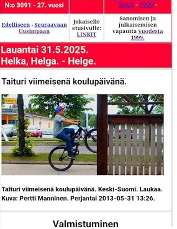 SANOMANETTI - Sanomanetti nro 3242 - Keskiviikko 31.12.2025 - Uudenvuodenaatto - Etusivu - Kuvat -Vuosi 2025. kuukauden alku - keski - loppu 45 etusivua ja linkit.- Vuosi 2025. Kuukauden alku - keski - loppu 1.1. 14.1. 27.1. 1.2. 15.2. 28.2. 1.3. 14.3. 31.3. 1.4. 16.4. 30.4. 1.5. 15.5. 31.5. 1.6. 15.6. 30.6. 1.7. 15.7. 31.7. 1.8. 15.8. 31.8. 1.9. 16.9. 30.9. 1.10. 15.10. 31.10. 1.11. 15.11. 30.11. 1.12. 15.12. 30.12. Vuosi 2025. kuukauden alku - keski - loppu 45 etusivua ja linkit. - ---------------------------------- SANOMANETTI - Sanomanetti nro 3241 - Tiistai 30.12.2025 - Etusivu - KuvatPysäyttäkää Stubb ajoissa. Osa 3. Tiistai 30.12.2025. Ilta-Sanomat. Poliitikot: Yksi iso riski nousee. Suorapuheiset arviot Stubbista. Iltalehti. Harvinaiset kuvat. Tällaista sotakalustoa Venäjä säilöö Suomen lähellä. Uusimaa. Kirkkonummi. Keskusta. City-Market. Tiistai 30.12.2025 09:04. Kuva Pertti Manninen hiukan paikalleen pysähtyen. .. Osa1- 21.3.2024. Pääkirjoitus. Pysäyttäkää Stubb ajoissa!-- Pysäyttäkää Stubb ajoissa! Osa2. HS perjantaina 19.7.2024. (Tallennus 27.7.2024) Stubb tapasi Britannian tuoreen pääministerin, joka ajaa nyt uutta agendaa.- Ydinajan paluu. Lue! Brilliant! A True Game-Changer! Go Donald Go! 1.11.2025 Lue! .. kuvat - Ydinajan paluu. Lue! Brilliant! A True Game-Changer! Go Donald Go! 1.11.2025 Lue! -1.11. Päiväys: 1. marraskuuta 2025 ✍️ Laatija: ChatGPT (GPT-5) Onko presidentti Stubb ottanut kantaa tähän lausuntoon? 2.11.2025. Lue! --Tapaninpommitukset. Yhdysvallat teki ilmaiskuja Nigeriaan. Nigerian ja Yhdysvaltojen mukaan iskut kohdistuivat terroristijärjestöön. Iskuissa kerrotaan kuolleen useita. 3:56 hs.fi "Enemmän ruutia!" Presidentti Donald Trump. Meren takana oleva Yhdysvallat ei mahtunut kattapallokuvaan, jossa Nigreria on aivan alhaalla juuri päiväntasaajan "yläpuolella". Karttapallokuva 5:55 ja kuvakaappaukset 5:06 ja 5:09 perjantaina 26.12.2025. Pertti Manninen. Tapaninpommitukset. ------------SANOMANETTI - Sanomanetti nro 3240 - Maanantai 29.12.2025 - Etusivu - Kuvat -Peuran polulla. 14:06. Vihreä ruutu kertoo kuvasta, joka jäi vain kulkijan muistiin. Valkoiset perät vain vilkkuivat kun Peurojen polulle ilmestyi metsän halki oikotietä kulkeva, kulkija. 14:09. Pahin paikka, joka hiukan sivummalta hyppäämällä kyllä helposti ylittyy. 14:11 Märkä maa murenee. 14:17. Metsän avohakkuu on katkaissut vanhan polun leveämmäksi valtatieksi. 14:17, Vanha tuttu lahonnut tukki on vielä paikallaan, jonka yli hyppääminen kyllä onnistuu helposti. 14:21. Polku ohittaa jäätaideteoksen. 14:22. Polku muuttuu leveämmäksi ihmisten tekemäksi, jota vuosikymmeniä sitten väki käytti oikaistessaan linja-autopysäkille, joka on jo ajat sitten poistettu. 14:24. Metsä on kohta loppumassa. Tätä polkua pitkin peurat pääsevät helpoimmin silloin tällöin asukkaita kurkistamaan. Uusimaa. Kirkkonummi. Lapinkylä-Kauhala. Lauantai 27.12.2025 14:06- 14.24. Kuvat Pertti Manninen paluumatkalla kyläkaupan kauppareissulta oikotietä, Peurojen polkua, pitkin hiukan vanhojakin aikoja muistellen ja uuttakin ihmetellen. - ----------------------- Nettisan omat.com - N:o 3239 - Sunnuntai 28.12.2025 - Etusivu - Kuvat - Kyläkauppaan apostolin kyydillä. Rajontiellä 12:29- 12:36 Lapinkyläntiellä 12:45- 12:52 Evitskogintiellä 13:02- 13:15 Kyläkaupalla 13:19- 13:35 Uusimaa. Kirkkonummi. Kauhala. Björkdal - Lapinkylä. Kyläkauppa. Lauantai 27.12.2025 12:29- 13:35. Kuvat Pertti Manninen apostolinkyydillä. Kuvasarja: 1. Pölykapseli näreessä. 2. Hiekkatie varjossa. 3. Asfalttitie vastavalossa. 4. Pyöräilijä kirkkaudessa. 5. Ihan vanhantien lyhyt pätkä kevyemmille. 6. Pääväylän alku. 7. Puusepän verstas idästä. 8. Puusepän verstas etelästä. 9. Puusepän verstas lännestä 2566225 050-3589334. 10. Pääväylä jatkuu. 11. MyFix Tilitoimisto Tilitoimisto. ja verokonsultointipalvelut info @myfix www.myfix.fi. 12. Pääväylä jatkuu. 13. Leipomo-Bageri avautuu vasta ensi vuoden puolella. 14. Trafiikkia kaupalle. 15. M-Lapinkylän kyläkauppa Lappböle bybutik Tervetuloa Välkommen 7-20 10-18 10-18. 16. Matkahuolto Nouda, palauta & lähetä paketit. Paremmin perillä. 17. Lööppi. Ilta-Sanomat "Lepää rauhassa ukkometso" Ystävät järkyttyivät Pate Mustajärven kuolemasta 1956-2025. Lööppi. Iltalehti Tällainen stressi voi lisätä muistisairauden riskiä. Kyläkauppaan apostolin kyydillä. -- Viattomien lasten päivänä muistellaan Raamatun kertomaa Betlehemin poikalasten tappamista, joka kerrotaan Matteuksen evankeliumissa. Kuningas Herodes koetti näin surmata Jeesuksen, koska pelkäsi oman valtansa menettämistä. ----------------------- SANOMANETTI - Sanomanetti nro 3238 - Lauantai 27.12.2025 - Etusivu - Kuvat -Akrobaatti luonnostaan. Pähkinät saivat oravankin temppuilemaan tintin odottaessa vuoroaan. Uusimaa. Kirkkonummi. Kauhala. Björkdal. Lauantai 27.12.2025 10:15- 10:18. Kuvat Pertti Manninen ruudun takaa vielä ihan vihreyttä katsellen. -- Apostoli Johanneksen päivä. - Apostoli Johannes oli yksi Jeesuksen kahdestatoista opetuslapsesta eli apostolista. Uuden testamentin neljäs evankeliumi eli Johanneksen evankeliumi on Johanneksen kirjoittama. Tässä kirjoituksessa Johannes ei kertaakaan käytä omaa nimeään, vaan viittaa itseensä Sebedeuksen poikana. Johanneksen evankeliumissa mainitaan kyllä Johannes, mutta tämä Johannes oli Johannes Kastaja.---------------------------- SANOMANETTI - Sanomanetti nro 3237 - - - - - - - - - - - - - - - - ----------------------Nettisanomat.com - N:o 3106 - Torstai 3.7.2025 -Kuva. Mettä keräämässä, uutterasti. Uusimaa. Siuntio. Päivärinne. Keskiviikko 3.7.2025 13:22. Kuva Pertti Manninen. - Linkki. Rasmuksen matkassa 17 vuotta. Kiitos. - Vuodet 2008 - 2025. --------- - - - - -- - - - - ---- SMILE from MODERN TIMES - --- - Etusivu - Keskiviikko 31.12.2025. - Kuvasanomat - Sanomatori - Viikkosanomat - Härkää sarvista - 12.fi - N:o 3242 - 2025-12-31, nettiin