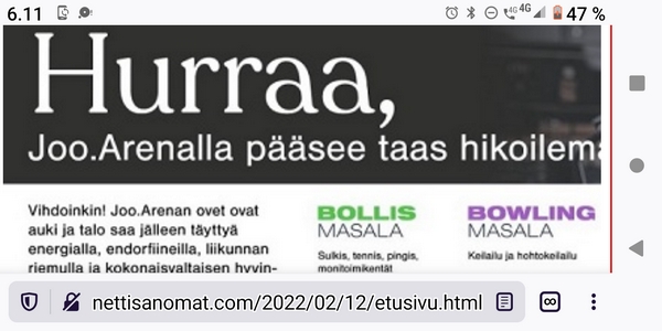 Kuvat 2022.02 Helmikuu 2022/02/05 - N:o 2459 - Helmikuun 5. päivänä 2022 J.L. Runeberg 218 vuotta. - 10 vuotta sitten. Kaksi ilmoitusta Keskisuomalainen- sanomalehdessä lauantaina 2012-02-04, Presidentinvaalien 2012 aattona. - Koko Suomen presidentti, hyvä keskustalainen teko. - Pekka-festarit. 2022/02/06 - N:o 2460 - Helmikuun 6. päivä 2022. Saamelaisten kansallispäivä. Kuva: "Miksi olette niin hienoina tänään? Nyt on saamelaisten syntymäpäivä." - Ylen Radio 1:stä Sovinto- ja totuuskomiteasta puheentunnistusohjelmalla: sarjasta epätäydellinen maailma: "... Sinä Irja Jefremoff ensimmäisenä tässä puheenjohtaja vuorossa ..." Kuvat lauantaina 12.2.2022. 2022/02/12 - N:o 2461 - Hurraa, pääsee taas hikoilemaan! Joo.Arena - Tätä on odotettu! Stepup School - Liike on lääkettä! Esport - Länsiväylän 9.2.2022 ilmoituksista. Kuvat sunnuntaina 13.2.2022. 2022/02/13 - N:o 2462 - Innostu & onnistu! Forever Pihlajalinna - Täydellistä rentoutumista! Kellumo - Kimpassa kuntoon! Espoon ohjattu liikunta - Kursseilla kondikseen! Espoon ohjattu liikunta - Hurraa, pääsee taas hikoilemaan! Joo.Arena - Tätä on odotettu! Stepup School - Liike on lääkettä! Esport - Länsiväylän 9.2.2022 ja 12.2.2022 ilmoituksista. Kuvat maanantaina 14.2.2022. Ystävänpäivä. 2022/02/14 - N:o 2463 - Ystävänpäivä. Niinistö ... toimia