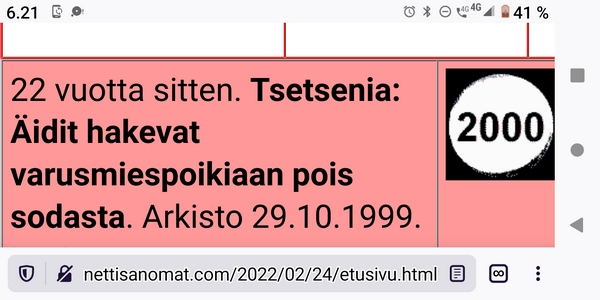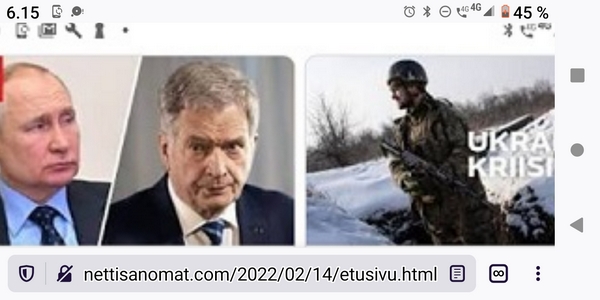 molemmille puolille toisten ajattelua. Kuvasarja ja linkit. 2022/02/20 - N:o 2464 - Pekingin olympialaisten loppu. Kuvassa naisten jääkiekkojoukkueen apulaiskapteeni (Petra Nieminen tai Michelle Karvinen) huutaa iloaan pronssiottelun päätössummerin soidessa. Kuvat maanantaina 21.2.2022. 2022/02/21- N:o 2465 - Sauli Niinistö kertoo CNN:lle: Putin käyttäytyy ennalta arvaamattomasti. Venäjä hämmentää kaksi askelta eteenpäin, yksi taakse-taktiikalla. Tilanne on nyt kylmempi kuin kylmän sodan aikaan. Emme pelkää Venäjän hyökkäystä Suomeen. Venäjä saattaa hämmentää tahallisesti. Yle, Iltalehti, Uusi Suomi. Kuvasarja. 2022/02/24 N:o 2466 - Yle Radio1 aamulla klo 5:58 puheentunnistuksella. Ukraina. 2022/02/27 N:o 2467 - Pääkirjoitus. Suomi lähettää tykkejä sotaan. Hallitus, presidentti, pääministeri Sanna Marin, tasavallan presidentti Sauli Niinistö, Yle. 2022/02/28 N:o 2468 - Kalevalan päivä on suomalaisen kulttuurin päivä. Kuvat sarjasta Kalevalan päivän, suomalaisen kulttuurin päivän, liputusta 28.02.2013. Kulkijan kuvia. Keski-Suomi. Jyväskylä. Maaliskuun 2022 kuvat täällä! |