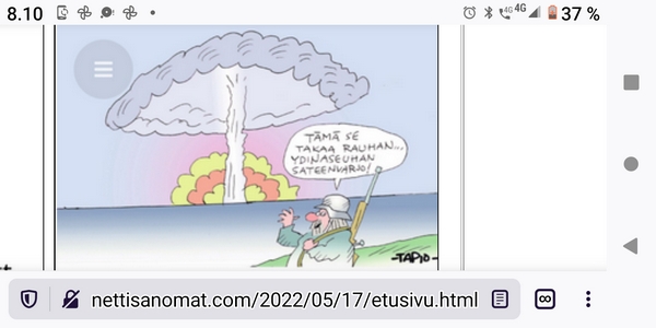 Kuvat 2022.05 Toukokuu 16.5-31.5. Kuvat maanantaina 16.5.2022. 2022/05/16 N:o 2513 - Tämä se tekee rauhan... ydinaserauhan sateenvarjo! (Tapio. Kirkkonummen Sanomat). 2022/05/16 N:o 2513 - Tästä ei kerrota suomalaisille. Suomesta tulossa ydinasevaltio, joka sitoutuu NATO:n ydinasedoktriiniin: First Use-doktriinin mukaan ydinaseita voidaan käyttää sellaisia maita vastaan, jotka eivät ole hyökänneet liittolaismaahan tai, joilla itsellään ei ole ydinaseita. 2022/05/16 N:o 2513 - SYYSKUU 2016. ORAVA TAMMESSA. 2022/05/16 N:o 2513 - Iltalehden lukijan kommentti. llmari H. "Kun 2/3 suomalaisista saatiin paniikkiin, ei puolueilla ollut muuta mahdollisuutta kuin lähteä leikkiin mukaan ja myöntää, että sieltä idästä tullaan ihan näillä viikoilla myös Suomeen. Mitäpä jos olisi väittänyt vastaan? Se tärkein, puolueen kannatusluvut olisivat laskeneet maan tasalle. Nyt kaikkien oli kannatettava Kokoomusta ja heidän alkuunpanemaa tärkeää gallup-tulosta." Kuva. 2022/05/17 N:o 2514 - Tämä se tekee rauhan... ydinaserauhan sateenvarjo! (Tapio. Kirkkonummen Sanomat). 2022/05/17 N:o 2514 - Tästä ei kerrota suomalaisille. Suomesta tulossa ydinasevaltio, joka sitoutuu NATO:n ydinasedoktriiniin: First Use-doktriinin mukaan ydinaseita voidaan käyttää sellaisia maita vastaan, jotka eivät ole hyökänneet liittolaismaahan tai, joilla itsellään ei ole ydinaseita. 2022/05/17 N:o 2514 - SYYSKUU 2016. ORAVA TAMMESSA. 2022/05/17 N:o 2514 - Eduskunta kannattaa Nato-jäsenyyden hakemista murskaluvuin 188-8. (Ilta-Sanomat). Kuva. Kuvat keskiviikkona 18.5.2022. 2022/05/18 N:o 2515 - Tämä se tekee rauhan... ydinaserauhan sateenvarjo! (Tapio. Kirkkonummen Sanomat). 2022/05/18 N:o 2515 - Tästä ei kerrota suomalaisille. Suomesta tulossa ydinasevaltio, joka sitoutuu NATO:n ydinasedoktriiniin: First Use-doktriinin mukaan ydinaseita voidaan käyttää sellaisia maita vastaan, jotka eivät ole hyökänneet liittolaismaahan tai, joilla itsellään ei ole ydinaseita. 2022/05/18 N:o 2515 - SYYSKUU 2016. ORAVA TAMMESSA. 2022/05/18 N:o 2515 - "... valitsemalla johtajalla voi olla maalleen keskellä turvallisuuspoliittisesti epävakaata ajassa.Olette ollut suuri johtaja Suomen kansalle. Kiitos panoksestanna siihen, Svenneling sanoi. Niinistö ei näyttänyt kovin riemastuneelta. Hän myös mutisi jotakin kuulumattomiin jäänyttä vieressään istuneelle valtiopäivien puheenjohtajall Anders Norlénille. (tunnistamaton). Kuva.