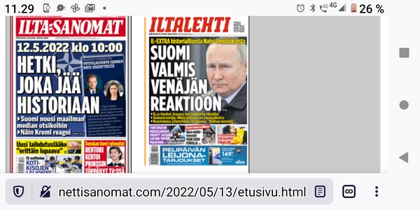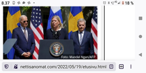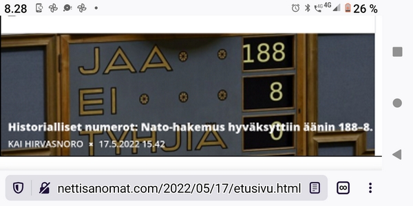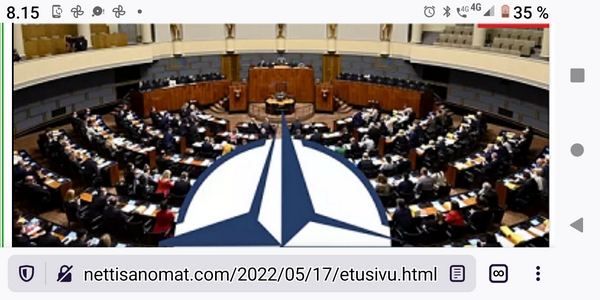 2022/05/15 N:o 2512 - Sunnuntai 15.5.2022. Natoviikolla. SDP:n historiallinen päätös. Suora lähetys kello 12:30 valtiojohto pitää tiedotustilaisuuden Natosta. Suomen matka Natoon alkaa tänään. Nato-ratkaisun hetket. Suomi päättää Natoon hakemisesta tänään. Valtiojohto tekee virallisen päätöksen Nato-jäsenyyden hakemisesta. Erno Laisin uutisanalyysi. Sanaa "historiallinen käytetään usein aivan liian heppoisin perustein. - Natoa vastustavalta Pekalta tiukka viesti valtionjohdolle - Marin: Kärnvapen paraplyet ger säkerhet. Inom Nato finns ett kärnvapenparaply vilket ger den sortens säkerhet, säger Marin. (Yle). Sanna Marin lyfte upp Natos kärnvapen som en säkerhetsgaranti. (Yle). Tämä se tekee rauhan... ydinaserauhan sateenvarjo! (Tapio. Kirkkonummen Sanomat). Kaikkonen kommentti. Pohjatyöt tehty - täältä tullaan. (Kirkkonummen Sanomat). Ruotsin tavoitteena Tanskan ja Norjan malli. (HS). Miten Ruotsi voi yhä toimia diktatuurien vastustajana ja rauhanvälittäjänä, jos maa on puolustusliitossa esimerkiksi Turkin kanssa. (Yle). - jRuotsi esittää yksipuolisesti varaumat ydinaseiden tai ulkomaisten tukikohtien sijoittamista vastaan. Suomi ei ole tehhyt omissa Nato-ilmoituksissaan vastaavia varaumia. (MTV Uutiset). Jenni Haukio twiittaa historiallisesta Nato ... (Iltalehti). Jenni Haukio kommentoi Nato-päätöstö: "Mieli täyttyy ... (Ilta-Sanomat). Jenni Haukio kommentoi Nato-päätöstä: "Mieli täyttyy suuresta ylpeydestä". Maamme on osaavissa käsissä". (Ilta-Sanomat). - Kiitos siitä kun päättäjät kuuntelevat Suomen kansaa (tani. Iltalehti). Missä se kuunteli?. Muutaman epämääräidsen gallupin perusteella, naurettavaa. kansanäänestys on ainut mikä olisi ollut oikea. Demokratian irvikuvaa oli tämä. - PUTIN HUILO. Koonnut sunnuntaina 15.5.2022 Pertti Manninen. -