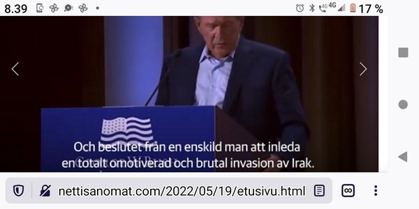Kuvat torstaina 19.5.2022. 2022/05/19 N:o 2516 - Kohtaaminen. Linjat 907 kohtaavat. Uusimaa. Kirkkonummi. Svartvik. Vitträsk. Torstai 19.5.2022 12:42. 2022/05/19 N:o 2516 - Kulttuuri. Musiikki. Paras soittaja ei välttämättä voita Sibelius-viulukilpailua, sillä venäläisopiskelijt suljettiin pois: Näin kiisteltyä päätöstä nyt perustellaan. Kahden Sibelius-viulukilpailun esikarsinnan läpäisseen osallistujan pääsy peruttiin Venäjän kansalaisuuden perusteella. Lauri Ratia vastaa päätöksen herättämään arvosteluun. (hs.fi/kulttuuri). Kuva 2022/05/19 N:o 2516 - Sekoaminen. George W Bush: - Och beslutetet från en enskild man att inleda totalt omotiverade och brutal invasion av Irak. (DN). 2022/05/18 N:o 2515 - Tästä ei kerrota suomalaisille. Suomesta tulossa ydinasevaltio, joka sitoutuu NATO:n ydinasedoktriiniin: First Use-doktriinin mukaan ydinaseita voidaan käyttää sellaisia maita vastaan, jotka eivät ole hyökänneet liittolaismaahan tai, joilla itsellään ei ole ydinaseita. 2022/05/19 N:o 2516 - SYYSKUU 2016. ORAVA TAMMESSA. Kuvat perjantaina 20.5.2022. 2022/05/20 N:o 2517 - Juhlien sotkija Iltalehdessä. (IL). 2022/05/20 N:o 2517 - Tästä ei kerrota suomalaisille. Suomesta tulossa ydinasevaltio, joka sitoutuu NATO:n ydinasedoktriiniin: First Use-doktriinin mukaan ydinaseita voidaan käyttää sellaisia maita vastaan, jotka eivät ole hyökänneet liittolaismaahan tai, joilla itsellään ei ole ydinaseita. 2022/05/20 N:o 2517 - SYYSKUU 2016. ORAVA TAMMESSA. Kuvat lauantaina 21.5.2022. 2022/05/21 N:o 2518 - Stafettkarnevalen. Yle Nyheter TV-Nytt. Lördag 21.5.2022. 19:46- 19:48. 2022/05/21 N:o 2518 - Tästä ei kerrota suomalaisille. Suomesta tulossa ydinasevaltio, joka sitoutuu NATO:n ydinasedoktriiniin: First Use-doktriinin mukaan ydinaseita voidaan käyttää sellaisia maita vastaan, jotka eivät ole hyökänneet liittolaismaahan tai, joilla itsellään ei ole ydinaseita. 2022/05/21 N:o 2518 - SYYSKUU 2016. ORAVA TAMMESSA. Kuvat sunnuntaina 22.5.2022. 2022/05/22 N:o 2519 - Tulitusta. Yle Uutiset. Sunnuntai 22.5.2022.
