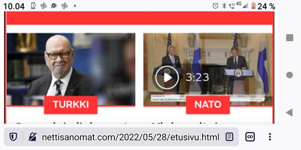2022/05/15 N:o 2512 - Sunnuntai 15.5.2022. Natoviikolla. SDP:n historiallinen päätös. Suora lähetys kello 12:30 valtiojohto pitää tiedotustilaisuuden Natosta. Suomen matka Natoon alkaa tänään. Nato-ratkaisun hetket. Suomi päättää Natoon hakemisesta tänään. Valtiojohto tekee virallisen päätöksen Nato-jäsenyyden hakemisesta. Erno Laisin uutisanalyysi. Sanaa "historiallinen käytetään usein aivan liian heppoisin perustein. - Natoa vastustavalta Pekalta tiukka viesti valtionjohdolle - Marin: Kärnvapen paraplyet ger säkerhet. Inom Nato finns ett kärnvapenparaply vilket ger den sortens säkerhet, säger Marin. (Yle). Sanna Marin lyfte upp Natos kärnvapen som en säkerhetsgaranti. (Yle). Tämä se tekee rauhan... ydinaserauhan sateenvarjo! (Tapio. Kirkkonummen Sanomat). Kaikkonen kommentti. Pohjatyöt tehty - täältä tullaan. (Kirkkonummen Sanomat). Ruotsin tavoitteena Tanskan ja Norjan malli. (HS). Miten Ruotsi voi yhä toimia diktatuurien vastustajana ja rauhanvälittäjänä, jos maa on puolustusliitossa esimerkiksi Turkin kanssa. (Yle). - jRuotsi esittää yksipuolisesti varaumat ydinaseiden tai ulkomaisten tukikohtien sijoittamista vastaan. Suomi ei ole tehhyt omissa Nato-ilmoituksissaan vastaavia varaumia. (MTV Uutiset). Jenni Haukio twiittaa historiallisesta Nato ... (Iltalehti). Jenni Haukio kommentoi Nato-päätöstö: "Mieli täyttyy ... (Ilta-Sanomat). Jenni Haukio kommentoi Nato-päätöstä: "Mieli täyttyy suuresta ylpeydestä". Maamme on osaavissa käsissä". (Ilta-Sanomat). - Kiitos siitä kun päättäjät kuuntelevat Suomen kansaa (tani. Iltalehti). Missä se kuunteli?. Muutaman epämääräidsen gallupin perusteella, naurettavaa. kansanäänestys on ainut mikä olisi ollut oikea. Demokratian irvikuvaa oli tämä. - PUTIN HUILO. Koonnut sunnuntaina 15.5.2022 Pertti Manninen. - |