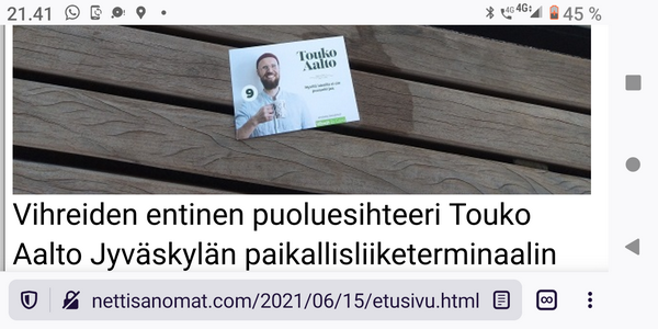 2021 "Kesäkuun 17." ![]() Vihreiden entinen puoluesihteeri Touko Aalto Jyväskylän paikallisliiketerminaalin penkillä maanantaina 7.6.2021 20:13. Valittiin Jyväskylän valtuustoon vihreistä toiseksi eniten ääniä saaneena puolueen menettäessä 2 valtuustopaikkaa. |