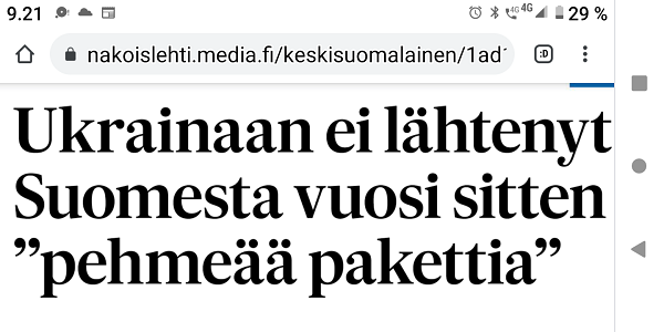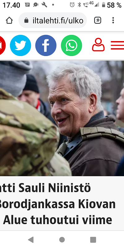 vientiluvasta, Ylelle kerrotaan." Pääkirjoitus. Olisi lupa vaikka Paavilta, niin Suomen hallitus pääministeri Marinin johdolla ja tasavallan presidentti Sauli Niiistö siis katsovat sopivaksi lähettää Suomen päätösvallassa olevia aseita sotatoimialueelle. Maailma on raaka. Tappaminen kuitenkaan lopu tappamalla ja näillä Niinistön ja Marinin lähettämillä aseilla sitten tapetaan venäläisiä sotilaita ja varmaan myös ukrainalaisiakin ja siviiliväestöä. Ei niiden osumatarkkuus ole 100 prosenttia ja sodassa ne voivat pian olla vastapuolenkin käytössä. Historia tulee kertomaan oliko Suomen hallituksen osumatarkkuus tässä asiassa paikallaan. Pääkirjoitus. Pertti Manninen sunnuntaina 27.2.2022 11:39. Lainaus ja kuva Ylen artikkelista: Venäjän hyökkäys |