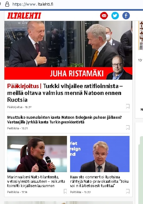 Pääkirjoitus: Ukrainan verinen tie Natoon. Venäjän julma ja verinen hyökkäys naapurimaahansa Ukrainaan jatkuu ja jatkuu. Nyt on menossa jo 168. päivä. Media käyttää tästä sodasta nimitystä "Ukrainan sota". Pikemminkin pitäisi käyttää nimitystä "Venäjän sota". Mitään rauhanneuvotteluja ei vielä käydä. Nato-maat ja Natoon