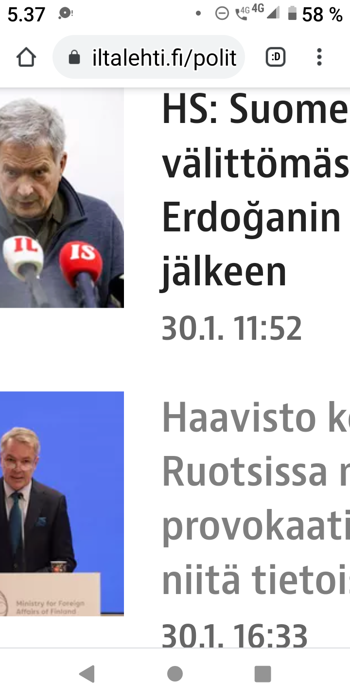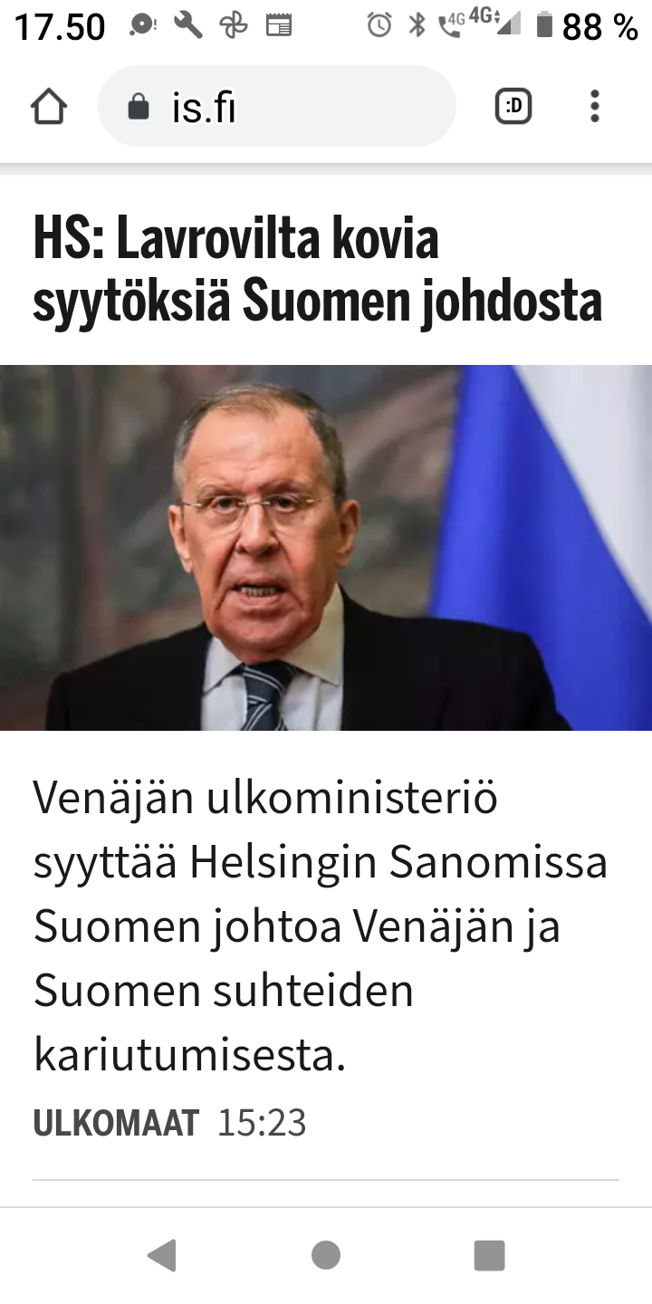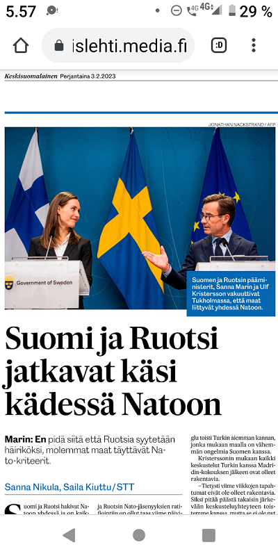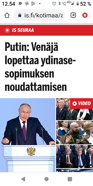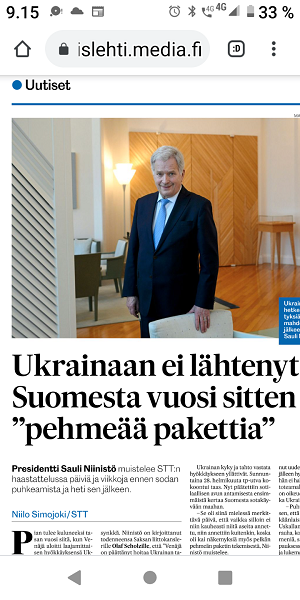2023 helmikuu. Perjantai 3.2.2023. Pääministeri Marin otti johtajan roolin:"Suomi ja Ruotsi jatkavat käsi kädessä Natoon." Lue! Perjantai 3.2.2023. Taipui ja osin taittuikin. Kuva Tiistaina 7.2.2023. Iltalehti: Presidentti Sauli Niinistö on joutunut vaihtamaan nimensäkin ... Lue! Perjantaina 10.2.2023. Hupsaus: Nadonlukua tammikuun lopulla 2023. Lue! Lauantaina 11.2.2023. 20 vuotta sitten Lue! - 15 vuotta sitten Lue! - 10 vuotta sitten Lue! - 5 vuotta sitten Lue! Lauantaina 11.2.2023. Vuosi sitten. Arkisto 27.2.2022. Lue! Lauantaina 11.2.2023. 20 vuotta sitten. Torstaina 13.2.2003. Lue! Sunnuntaina 12.2.2023. "Puhun rauhasta ymmärtäen sen, että tällä hetkellä ei ole minkäänlaisia edellytyksiä rauhaan." Presidentti Sauli Niinistö. Lue! Sunnuntaina 12.2.2023. Ukrainaan ei lähtenyt Suomesta vuosi sitten "pehmeää pakettia". Lue! Sunnuntaina 19.2.2023. Marin: Venäjä olisi pitänyt eristää jo aiemmin - Niinistö: Suomen reaktio näkyi teoista. Lue! Sunnuntaina 19.2.2023. Arkisto 2005. Leif Salmén. Voiton päivä? Kolumni. Lue! Tiistaina 21.2.2023. Tähän on tultu. Putin: Venäjä jäädyttää ydinasesopimuksen tai lopettaa noudattamisen. Lue! Tiistaina 28.2.2023. Kalevalan päivän liputusta 2013 ja 2023. |