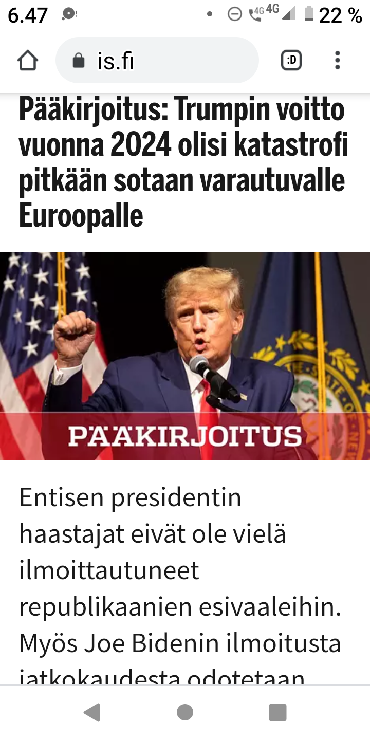 Niinistö, Nato ja Trump. Suomen presidentin väärinkäsitys USA:n presidentin vallasta.marraskuu 10, 2016 Yhdysvaltain presidentin vallasta presidentti Sauli Niinistöllä on väärä käsitys. Iltalehden pääkirjoitussivulla olevan meilin mukaan: ”Suomen mahdollisen Nato-jäsenyyden osalta totesitte, että niin jäsenyys kuin Natokaan ei ole riippuvainen yhdestä ihmisestä, vaikka tämä olisi Yhdysvaltain presidentti.” Niinistö on väärässä: Tässä asiassa ei kävellä presidentti Donald Trumpin yli. Jos Trump haluaa, että Nato ei laajene esim. Suomen jäsenyydellä, niin ei sitten laajene. Ei kai Niinistö tarkoita sitä, että tarvittaessa laajentumista vastustava USA:n presidentti voidaan hiljentää ja eliminoida. Ehkä siellä Naton käytävillä, jossa ko. lausunto annettiin tuli niin mahtava olo, että tosiasiatkin hämärtyivät. Viikkosanomat. Pertti Manninen. Torstai 2016-11-10 19:09. Tags: Donald Trump, jäsenyys, Lue myös! |