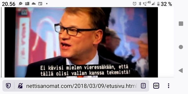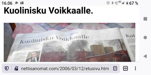 Lauantaina 4.3.2023. Ydinasevaltio Suomi. Lue! Perjantaina 3.3.2023. Arkisto. Maanantai 16.4.2007 klo 14.30. Pääministerikin lukee Nettisanomia! Suomalaiset herrasmiehet Matti Vanhanen ja Jyrki Katainen. Lue! Keskiviikkona 1.3.2023. Jotakin maaliskuussa 2000- 2022. Lue! Tiistaina 28.2.2023. Kalevalan päivän liputusta 2013 ja 2023. Kuvat Tiistaina 21.2.2023. Tähän on tultu. Putin: Venäjä jäädyttää ydinasesopimuksen tai lopettaa noudattamisen. Lue! |