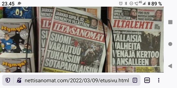 2023 helmikuu. Perjantai 3.2.2023. Pääministeri Marin otti johtajan roolin:"Suomi ja Ruotsi jatkavat käsi kädessä Natoon." Lue! Perjantai 3.2.2023. Taipui ja osin taittuikin. Kuva Tiistaina 7.2.2023. Iltalehti: Presidentti Sauli Niinistö on joutunut vaihtamaan nimensäkin ... Lue! Perjantaina 10.2.2023. Hupsaus: Nadonlukua tammikuun lopulla 2023. Lue! Lauantaina 11.2.2023. 20 vuotta sitten Lue! - 15 vuotta sitten Lue! - 10 vuotta sitten Lue! - 5 vuotta sitten Lue! Lauantaina 11.2.2023. Vuosi sitten. Arkisto 27.2.2022. Lue! Lauantaina 11.2.2023. 20 vuotta sitten. Torstaina 13.2.2003. Lue! Sunnuntaina 12.2.2023. "Puhun rauhasta ymmärtäen sen, että tällä hetkellä ei ole minkäänlaisia edellytyksiä rauhaan." Presidentti Sauli Niinistö. Lue! Sunnuntaina 12.2.2023. Ukrainaan ei lähtenyt Suomesta vuosi sitten "pehmeää pakettia". Lue! Sunnuntaina 19.2.2023. Marin: Venäjä olisi pitänyt eristää jo aiemmin - Niinistö: Suomen reaktio näkyi teoista. Lue! Sunnuntaina 19.2.2023. Arkisto 2005. Leif Salmén. Voiton päivä? Kolumni. Lue! Tiistaina 21.2.2023. Tähän on tultu. Putin: Venäjä jäädyttää ydinasesopimuksen tai lopettaa noudattamisen. Lue! Tiistaina 28.2.2023. Kalevalan päivän liputusta 2013 ja 2023. |